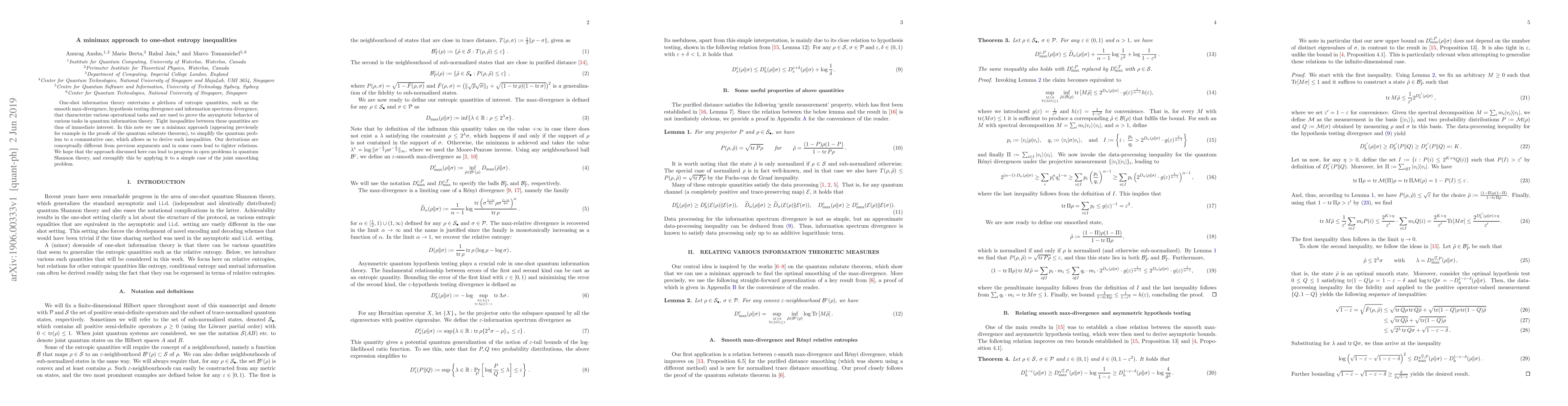 This paper employs a minimax approach to derive tighter inequalities between various entropic quantities in one-shot information theory, simplifying quantum problems to commutative ones. The method offers a conceptually novel derivation that could advance solutions to open problems in quantum Shannon theory.