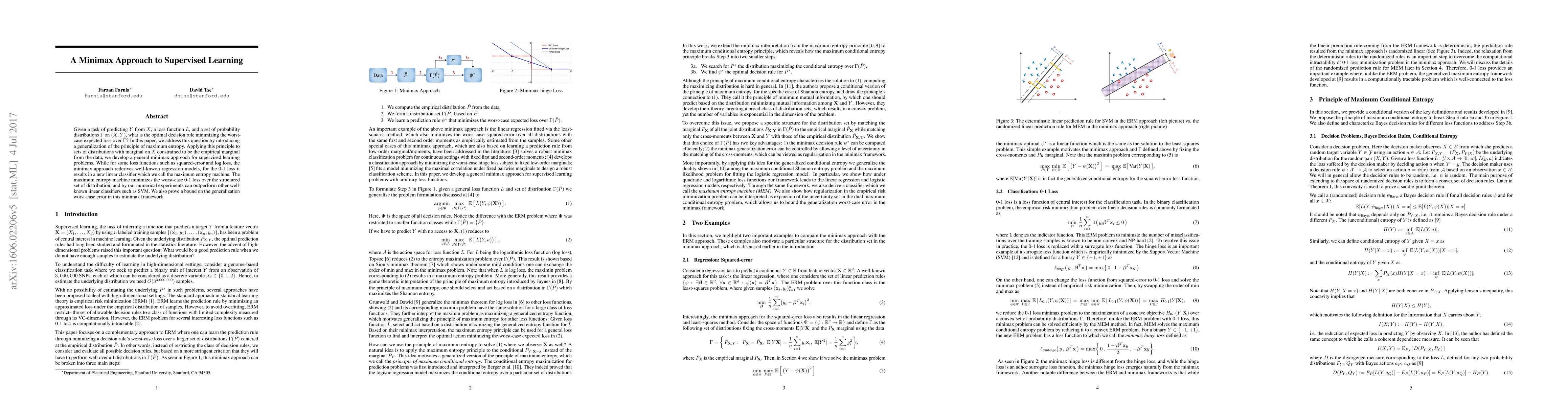This paper proposes a minimax approach to supervised learning that generalizes the principle of maximum entropy to find optimal decision rules minimizing worst-case expected loss. It introduces the maximum entropy machine, a new linear classifier for 0-1 loss, which outperforms other classifiers like SVM in numerical experiments.