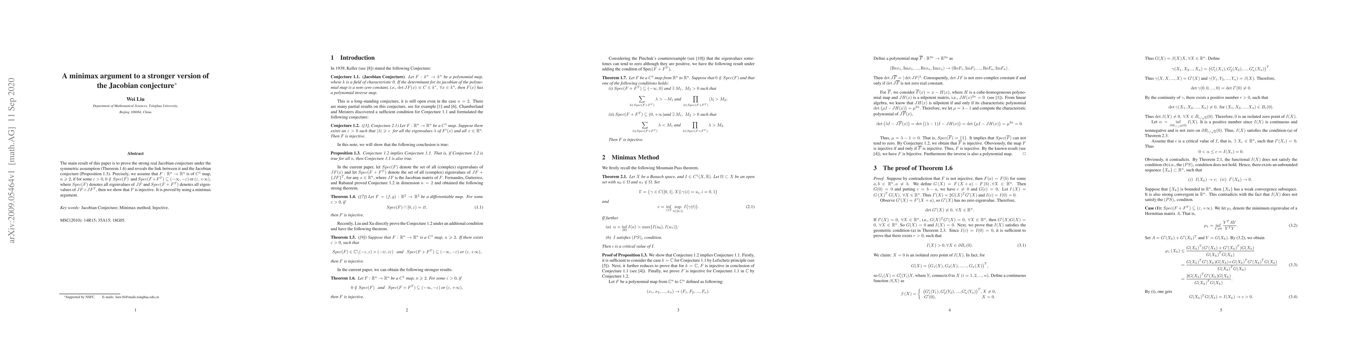This paper proves a stronger version of the Jacobian conjecture under symmetric assumptions, showing that a certain class of $C^1$ maps are injective using a minimax argument.