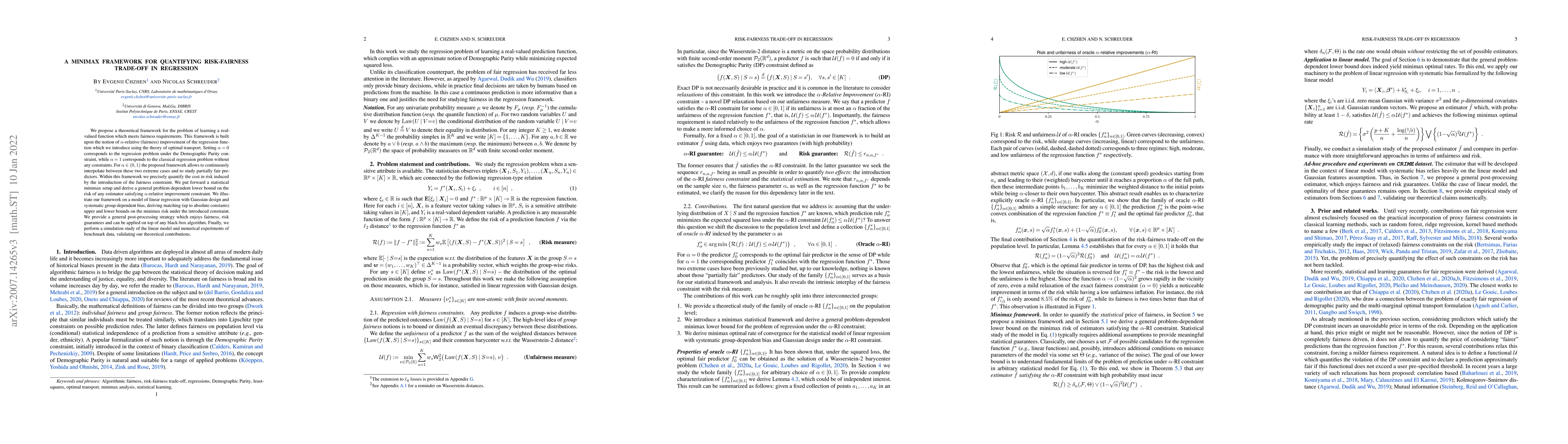 We propose a theoretical framework for the problem of learning a real-valued function which meets fairness requirements. This framework is built upon the notion of $\alpha$-relative (fairness) improvement of the regression function which we introduce using the theory of optimal transport. Setting $\alpha = 0$ corresponds to the regression problem under the Demographic Parity constraint, while $\alpha = 1$ corresponds to the classical regression problem without any constraints. For $\alpha \in (0, 1)$ the proposed framework allows to continuously interpolate between these two extreme cases and to study partially fair predictors. Within this framework we precisely quantify the cost in risk induced by the introduction of the fairness constraint. We put forward a statistical minimax setup and derive a general problem-dependent lower bound on the risk of any estimator satisfying $\alpha$-relative improvement constraint. We illustrate our framework on a model of linear regression with Gaussian design and systematic group-dependent bias, deriving matching (up to absolute constants) upper and lower bounds on the minimax risk under the introduced constraint. We provide a general post-processing strategy which enjoys fairness, risk guarantees and can be applied on top of any black-box algorithm. Finally, we perform a simulation study of the linear model and numerical experiments of benchmark data, validating our theoretical contributions.