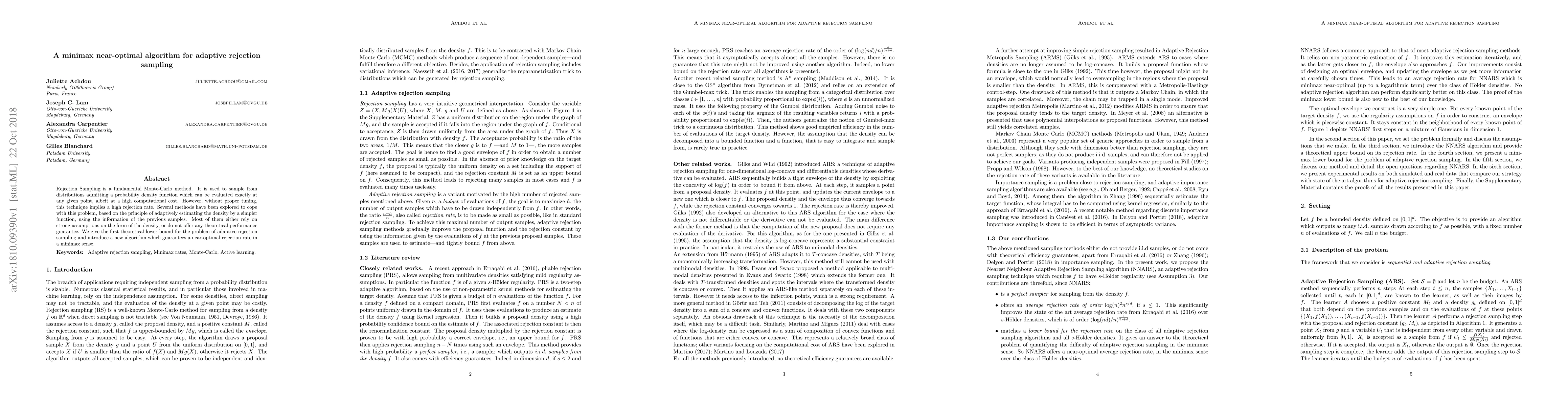 This paper presents a novel adaptive rejection sampling algorithm that provides a near-optimal rejection rate with theoretical minimax guarantees, addressing the high computational cost and rejection rate issues inherent in traditional rejection sampling methods. The algorithm adaptively estimates the density function without relying on strong assumptions about its form.