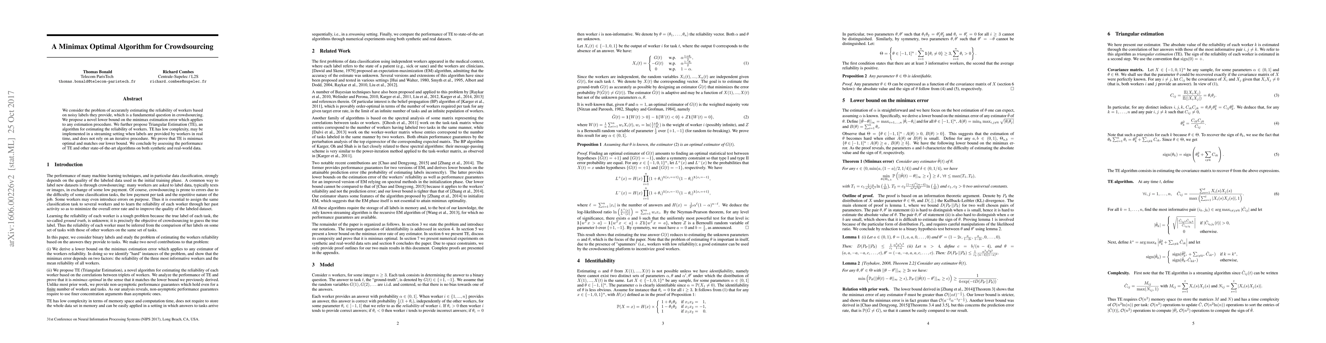 A new algorithm called Triangular Estimation (TE) is proposed to accurately estimate worker reliability in crowdsourcing, with a lower bound on minimax estimation error that matches the optimal solution.