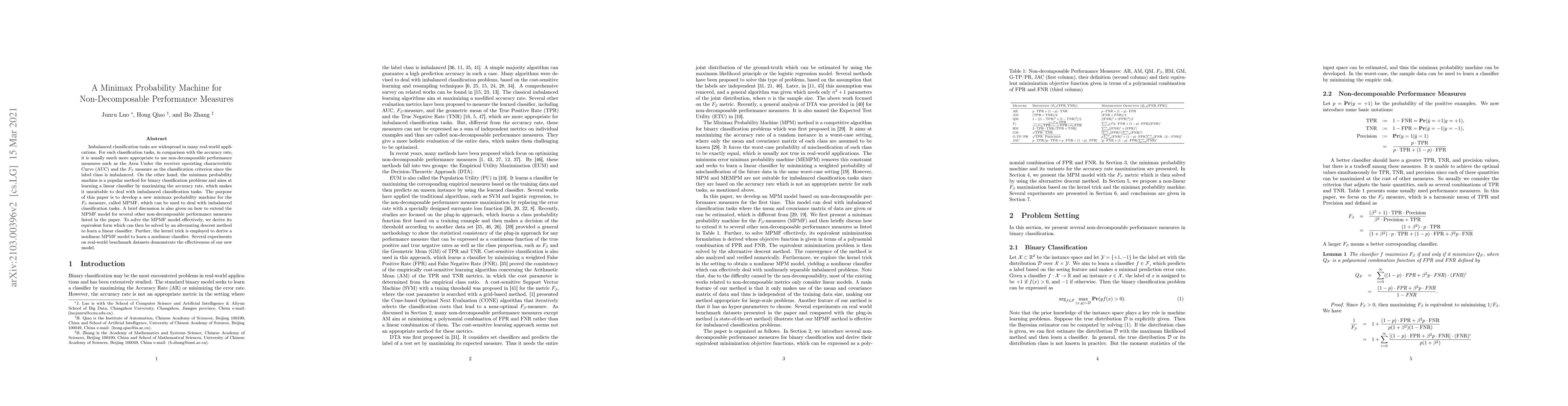 This paper proposes a new minimax probability machine (MPMF) for non-decomposable performance measures like the $F_\beta$ measure to handle imbalanced classification tasks. The MPMF model is extended to other performance measures and solved using an alternating descent method, with a kernel trick for nonlinear classifiers, demonstrating effectiveness on benchmark datasets.