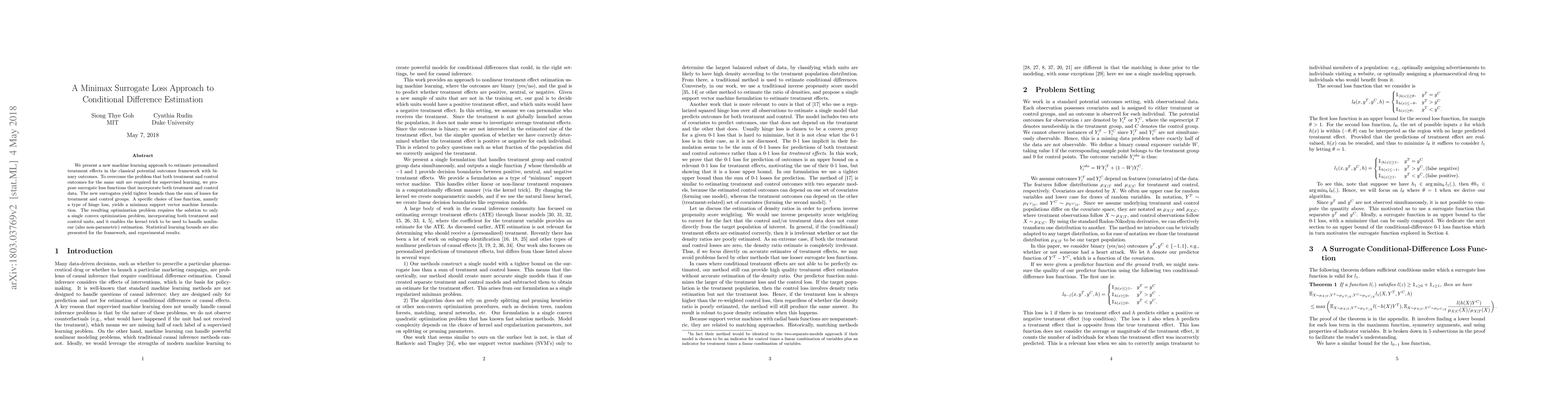 We present a new machine learning approach to estimate personalized treatment effects in the classical potential outcomes framework with binary outcomes. To overcome the problem that both treatment and control outcomes for the same unit are required for supervised learning, we propose surrogate loss functions that incorporate both treatment and control data. The new surrogates yield tighter bounds than the sum of losses for treatment and control groups. A specific choice of loss function, namely a type of hinge loss, yields a minimax support vector machine formulation. The resulting optimization problem requires the solution to only a single convex optimization problem, incorporating both treatment and control units, and it enables the kernel trick to be used to handle nonlinear (also non-parametric) estimation. Statistical learning bounds are also presented for the framework, and experimental results.