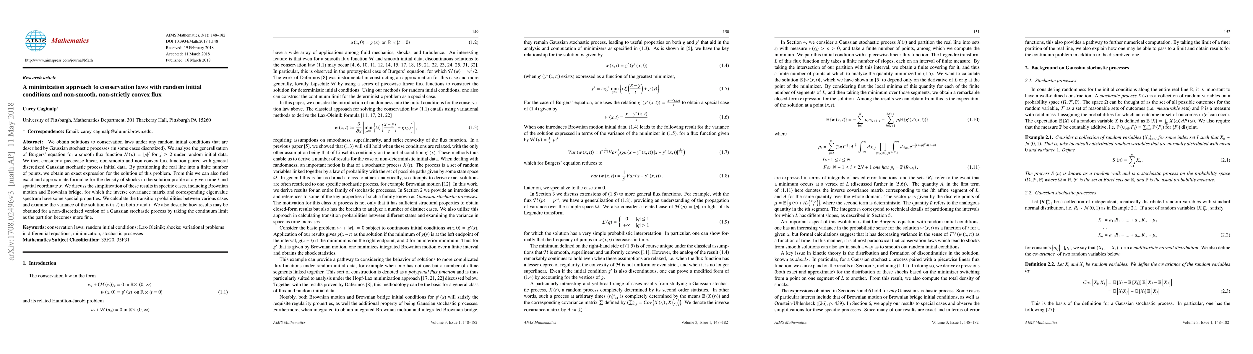 We obtain solutions to conservation laws under any random initial conditions that are described by Gaussian stochastic processes (in some cases discretized). We analyze the generalization of Burgers' equation for a smooth flux function $H\left( p\right) =\left\vert p\right\vert ^{j}$ for $j\geq2$ under random initial data. We then consider a piecewise linear, non-smooth and non-convex flux function paired with general discretized Gaussian stochastic process initial data. By partitioning the real line into a finite number of points, we obtain an exact expression for the solution of this problem. From this we can also find exact and approximate formulae for the density of shocks in the solution profile at a given time $t$ and spatial coordinate $x$. We discuss the simplification of these results in specific cases, including Brownian motion and Brownian bridge, for which the inverse covariance matrix and corresponding eigenvalue spectrum have some special properties. We calculate the transition probabilities between various cases and examine the variance of the solution $w\left(x,t\right)$ in both $x$ and $t$. We also describe how results may be obtained for a non-discretized version of a Gaussian stochastic process by taking the continuum limit as the partition becomes more fine.