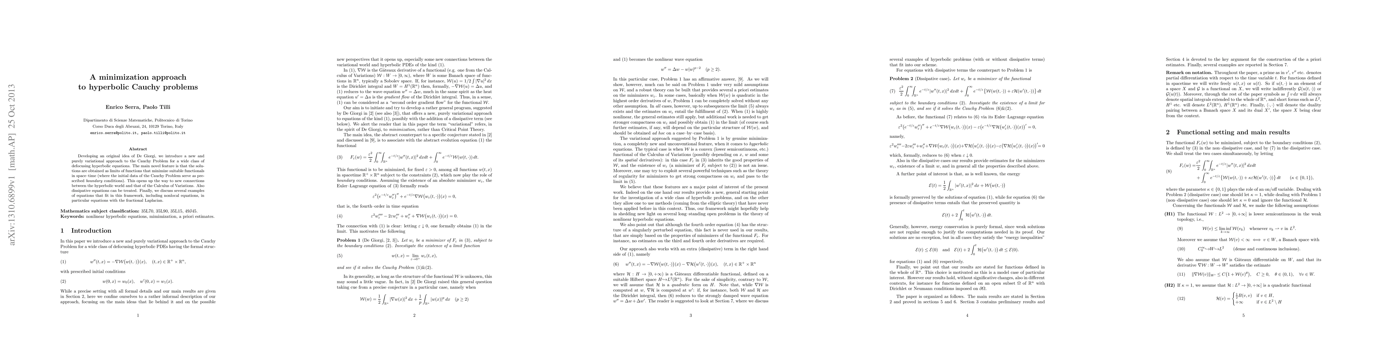 Developing an original idea of De Giorgi, we introduce a new and purely variational approach to the Cauchy Problem for a wide class of defocusing hyperbolic equations. The main novel feature is that the solutions are obtained as limits of functions that minimize suitable functionals in space-time (where the initial data of the Cauchy Problem serve as prescribed boundary conditions). This opens up the way to new connections between the hyperbolic world and that of the Calculus of Variations. Also dissipative equations can be treated. Finally, we discuss several examples of equations that fit in this framework, including nonlocal equations, in particular equations with the fractional Laplacian.