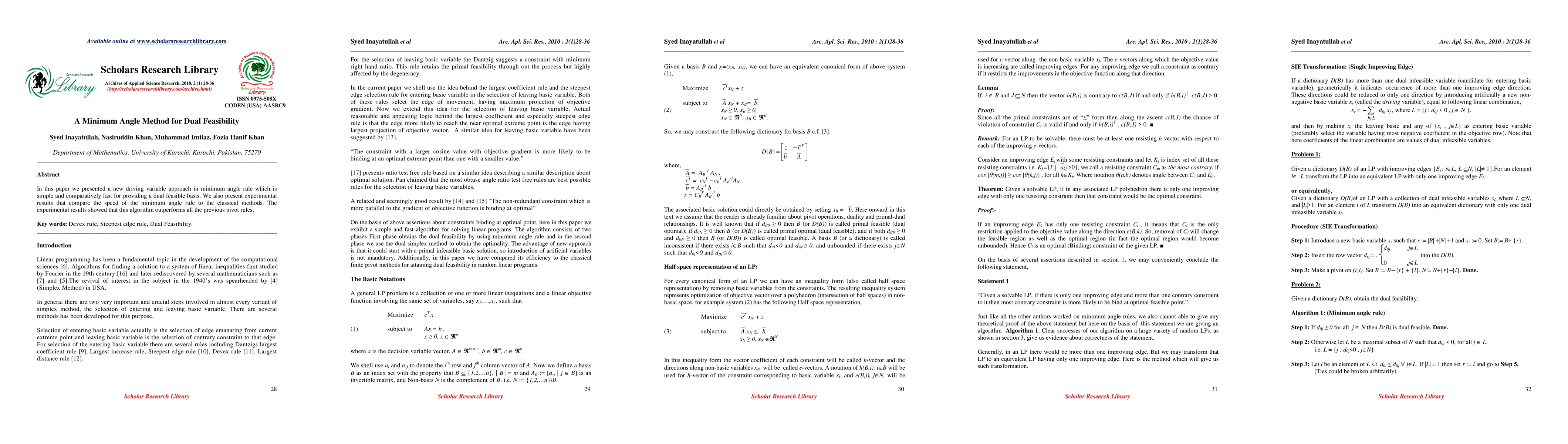 In this paper we presented a new driving variable approach in minimum angle rule which is simple and comparatively fast for providing a dual feasible basis. We also present experimental results that compare the speed of the minimum angle rule to the classical methods. The experimental results showed that this algorithm outperforms all the previous pivot rules.
