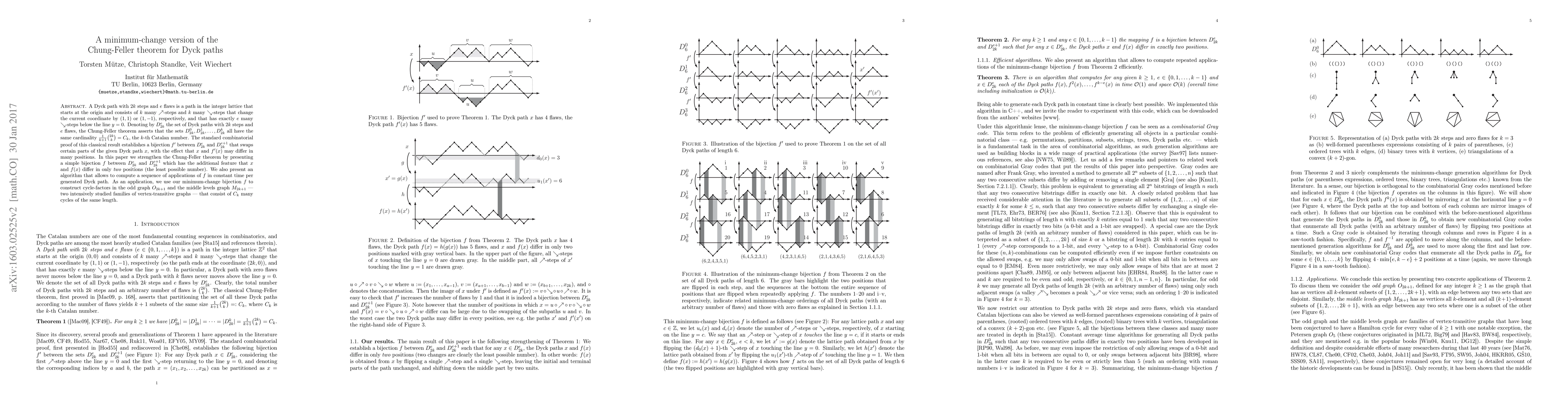 A Dyck path with $2k$ steps and $e$ flaws is a path in the integer lattice that starts at the origin and consists of $k$ many $\nearrow$-steps and $k$ many $\searrow$-steps that change the current coordinate by $(1,1)$ or $(1,-1)$, respectively, and that has exactly $e$ many $\searrow$-steps below the line $y=0$. Denoting by $D_{2k}^e$ the set of Dyck paths with $2k$ steps and $e$ flaws, the Chung-Feller theorem asserts that the sets $D_{2k}^0,D_{2k}^1,\ldots,D_{2k}^k$ all have the same cardinality $\frac{1}{k+1}\binom{2k}{k}=C_k$, the $k$-th Catalan number. The standard combinatorial proof of this classical result establishes a bijection $f'$ between $D_{2k}^e$ and $D_{2k}^{e+1}$ that swaps certain parts of the given Dyck path $x$, with the effect that $x$ and $f'(x)$ may differ in many positions. In this paper we strengthen the Chung-Feller theorem by presenting a simple bijection $f$ between $D_{2k}^e$ and $D_{2k}^{e+1}$ which has the additional feature that $x$ and $f(x)$ differ in only two positions (the least possible number). We also present an algorithm that allows to compute a sequence of applications of $f$ in constant time per generated Dyck path. As an application, we use our minimum-change bijection $f$ to construct cycle-factors in the odd graph $O_{2k+1}$ and the middle levels graph $M_{2k+1}$ --- two intensively studied families of vertex-transitive graphs --- that consist of $C_k$ many cycles of the same length.