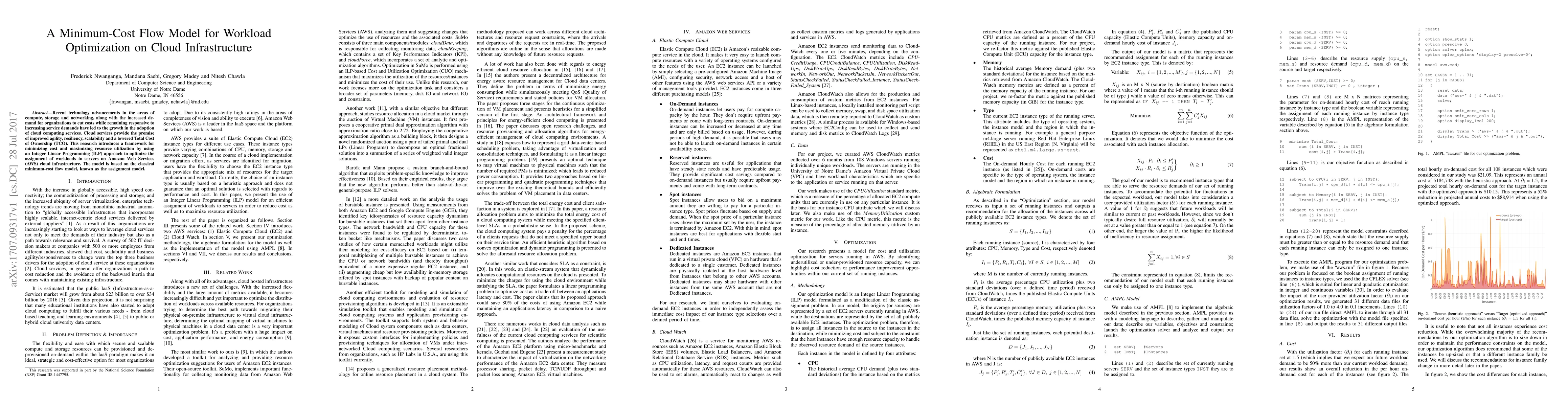 Recent technology advancements in the areas of compute, storage and networking, along with the increased demand for organizations to cut costs while remaining responsive to increasing service demands have led to the growth in the adoption of cloud computing services. Cloud services provide the promise of improved agility, resiliency, scalability and a lowered Total Cost of Ownership (TCO). This research introduces a framework for minimizing cost and maximizing resource utilization by using an Integer Linear Programming (ILP) approach to optimize the assignment of workloads to servers on Amazon Web Services (AWS) cloud infrastructure. The model is based on the classical minimum-cost flow model, known as the assignment model.