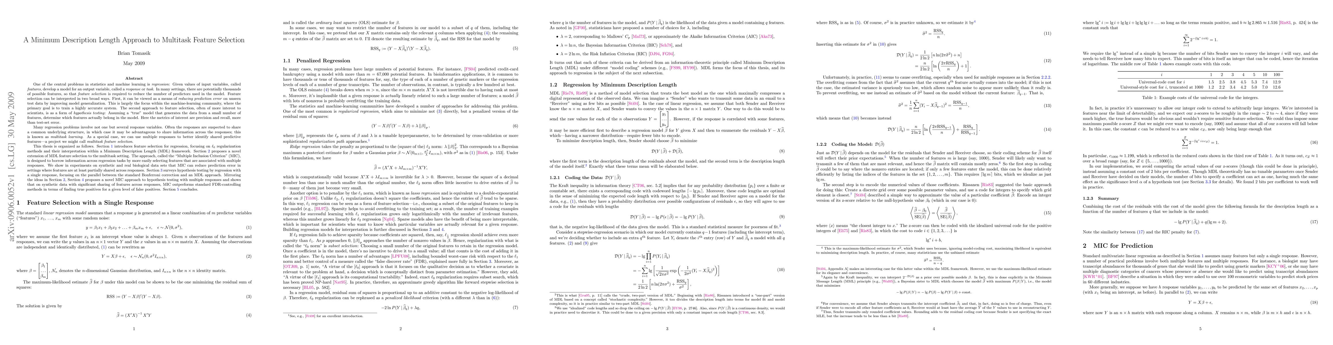 Many regression problems involve not one but several response variables (y's). Often the responses are suspected to share a common underlying structure, in which case it may be advantageous to share information across them; this is known as multitask learning. As a special case, we can use multiple responses to better identify shared predictive features -- a project we might call multitask feature selection. This thesis is organized as follows. Section 1 introduces feature selection for regression, focusing on ell_0 regularization methods and their interpretation within a Minimum Description Length (MDL) framework. Section 2 proposes a novel extension of MDL feature selection to the multitask setting. The approach, called the "Multiple Inclusion Criterion" (MIC), is designed to borrow information across regression tasks by more easily selecting features that are associated with multiple responses. We show in experiments on synthetic and real biological data sets that MIC can reduce prediction error in settings where features are at least partially shared across responses. Section 3 surveys hypothesis testing by regression with a single response, focusing on the parallel between the standard Bonferroni correction and an MDL approach. Mirroring the ideas in Section 2, Section 4 proposes a novel MIC approach to hypothesis testing with multiple responses and shows that on synthetic data with significant sharing of features across responses, MIC sometimes outperforms standard FDR-controlling methods in terms of finding true positives for a given level of false positives. Section 5 concludes.