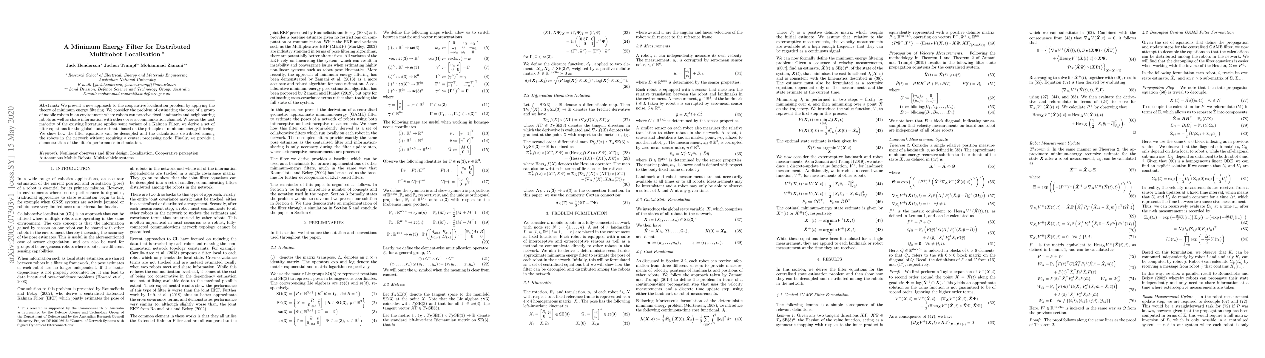 We present a new approach to the cooperative localisation problem by applying the theory of minimum energy filtering. We consider the problem of estimating the pose of a group of mobile robots in an environment where robots can perceive fixed landmarks and neighbouring robots as well as share information with others over a communication channel. Whereas the vast majority of the existing literature applies some variant of a Kalman Filter, we derive a set of filter equations for the global state estimate based on the principle of minimum energy filtering. We show how the filter equations can be decoupled and the calculations distributed among the robots in the network without requiring a central processing node. Finally, we provide a demonstration of the filter's performance in simulation.