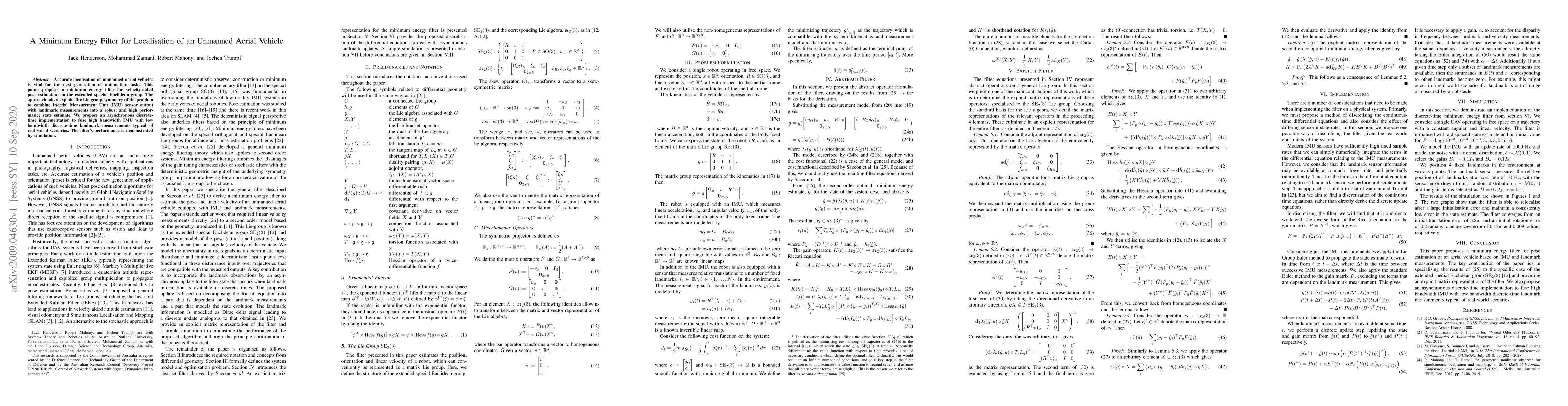 Accurate localisation of unmanned aerial vehicles is vital for the next generation of automation tasks. This paper proposes a minimum energy filter for velocity-aided pose estimation on the extended special Euclidean group. The approach taken exploits the Lie-group symmetry of the problem to combine Inertial Measurement Unit (IMU) sensor output with landmark measurements into a robust and high performance state estimate. We propose an asynchronous discrete-time implementation to fuse high bandwidth IMU with low bandwidth discrete-time landmark measurements typical of real-world scenarios. The filter's performance is demonstrated by simulation.