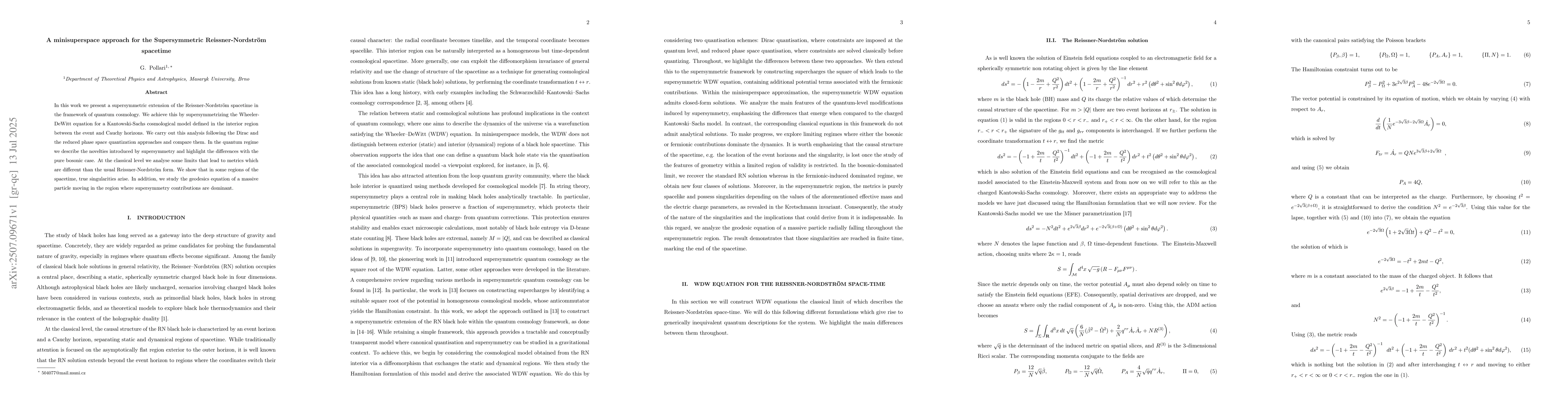 In this work we present a supersymmetric extension of the Reissner-Nordstr\"om spacetime in the framework of quantum cosmology. We achieve this by supersymmetrizing the Wheeler-DeWitt equation for a Kantowski-Sachs cosmological model defined in the interior region between the event and Cauchy horizons. We carry out this analysis following the Dirac and the reduced phase space quantization approaches and compare them. In the quantum regime we describe the novelties introduced by supersymmetry and highlight the differences with the pure bosonic case. At the classical level we analyse some limits that lead to metrics which are different than the usual Reissner-Nordstr\"om form. We show that in some regions of the spacetime, true singularities arise. In addition, we study the geodesics equation of a massive particle moving in the region where supersymmetry contributions are dominant.