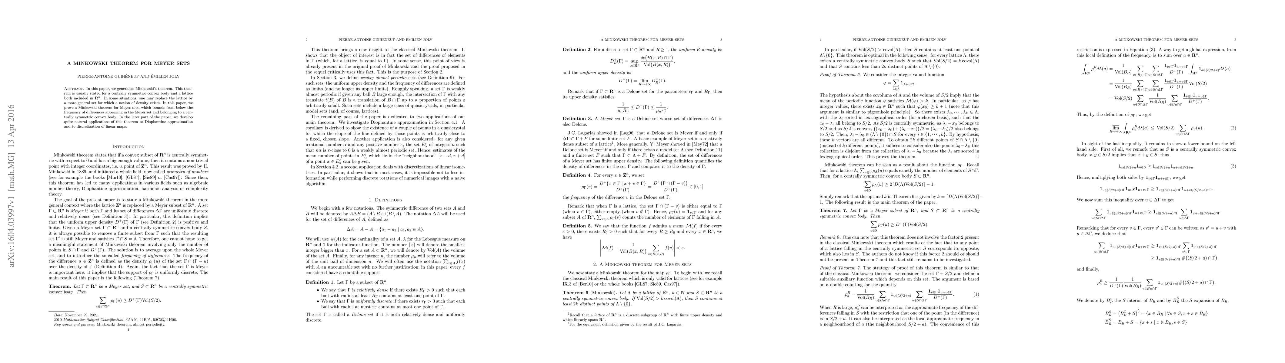 In this paper, we generalize Minkowski's theorem. This theorem is usually stated for a centrally symmetric convex body and a lattice both included in $\mathbb{R}^n$. In some situations, one may replace the lattice by a more general set for which a notion of density exists. In this paper, we prove a Minkowski theorem for Meyer sets, which bounds from below the frequency of differences appearing in the Meyer set and belonging to a centrally symmetric convex body. In the later part of the paper, we develop quite natural applications of this theorem to Diophantine approximation and to discretization of linear maps.