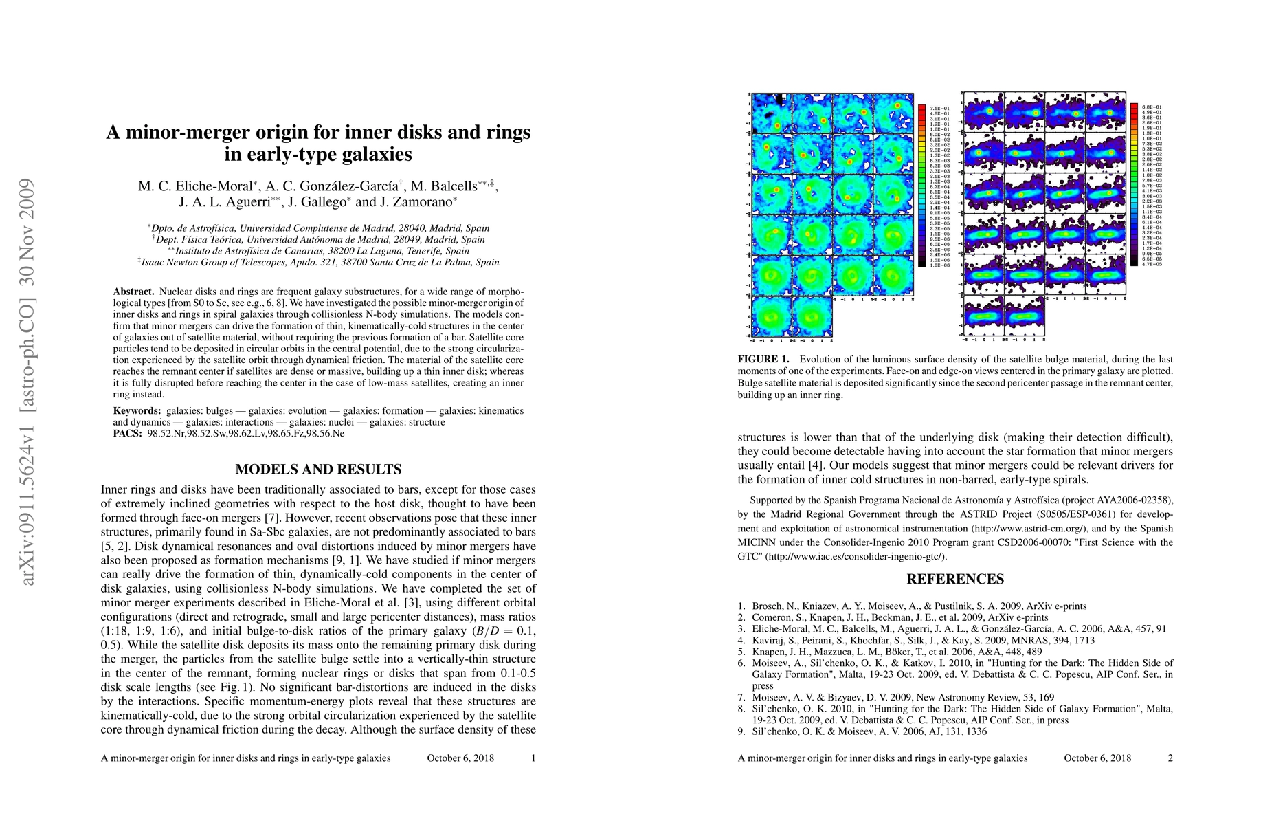 This paper investigates the formation of nuclear disks and rings in early-type galaxies through minor-merger simulations, confirming that minor mergers can create thin, cold central structures from satellite material without pre-existing bars. The study finds that dense or massive satellites form inner disks, while less massive ones create inner rings.