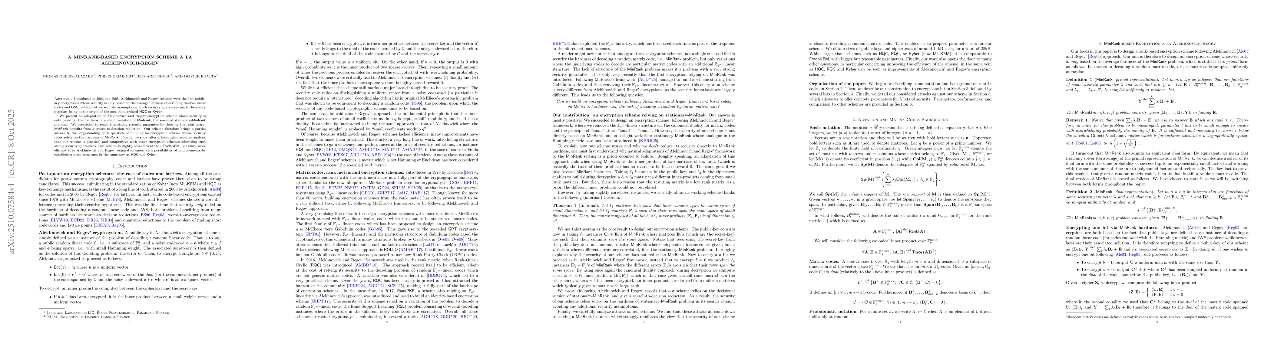 Introduced in 2003 and 2005, Alekhnovich and Regev' schemes were the first public-key encryptions whose security is only based on the average hardness of decoding random linear codes and LWE, without other security assumptions. Such security guarantees made them very popular, being at the origin of the now standardized HQC or Kyber. We present an adaptation of Alekhnovich and Regev' encryption scheme whose security is only based on the hardness of a slight variation of MinRank, the so-called stationary-MinRank problem. We succeeded to reach this strong security guarantee by showing that stationary-MinRank benefits from a search-to-decision reduction. Our scheme therefore brings a partial answer to the long-standing open question of building an encryption scheme whose security relies solely on the hardness of MinRank. Finally, we show after a thoroughly security analysis that our scheme is practical and competitive with other encryption schemes admitting such strong security guarantees. Our scheme is slightly less efficient than FrodoKEM, but much more efficient than Alekhnovich and Regev' original schemes, with possibilities of improvements by considering more structure, in the same way as HQC and Kyber.