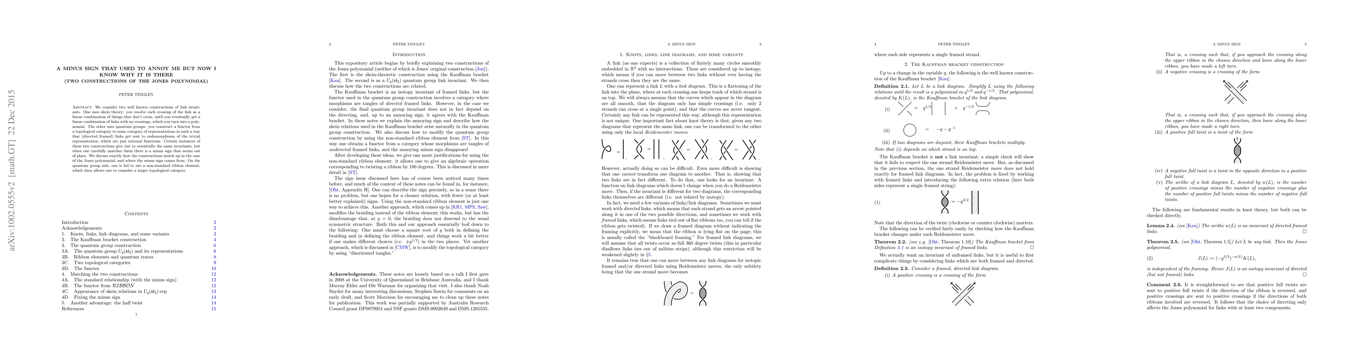 We consider two well known constructions of link invariants. One uses skein theory: you resolve each crossing of the link as a linear combination of things that don't cross, until you eventually get a linear combination of links with no crossings, which you turn into a polynomial. The other uses quantum groups: you construct a functor from a topological category to some category of representations in such a way that (directed framed) links get sent to endomorphisms of the trivial representation, which are just rational functions. Certain instances of these two constructions give rise to essentially the same invariants, but when one carefully matches them there is a minus sign that seems out of place. We discuss exactly how the constructions match up in the case of the Jones polynomial, and where the minus sign comes from. On the quantum group side, one is led to use a non-standard ribbon element, which then allows one to consider a larger topological category.