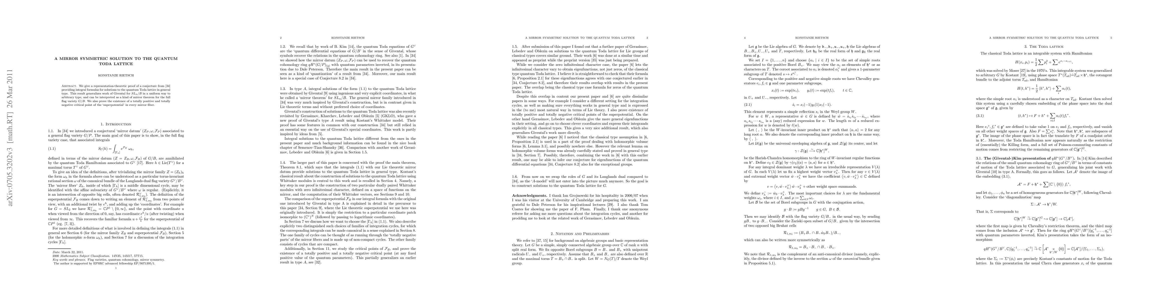 This paper constructs integral solutions for the quantum Toda lattice using representation theory, generalizing Givental's work for arbitrary types and establishing a mirror theorem for the full flag variety G/B. It also proves the existence of a totally positive critical point in every mirror fiber.