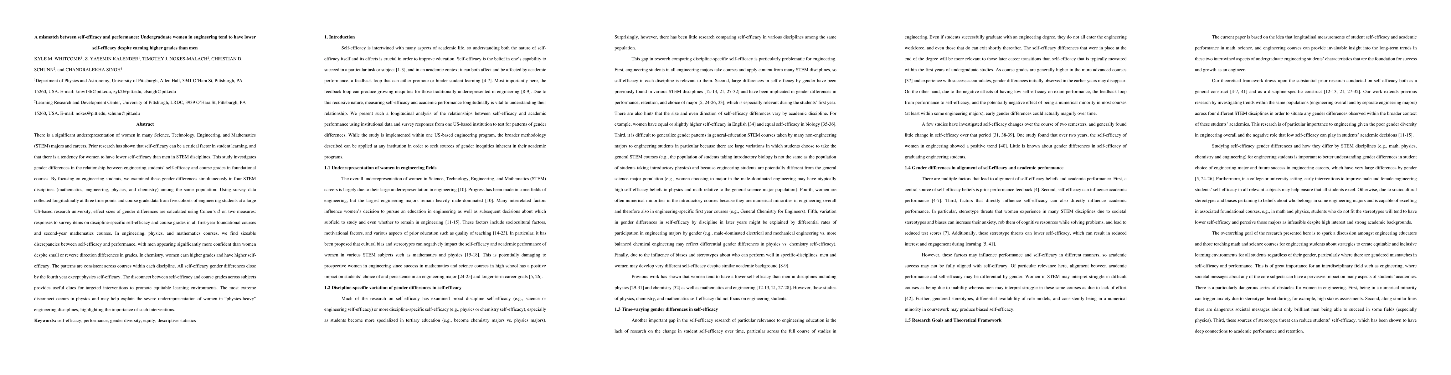 This study reveals that female engineering undergraduates exhibit lower self-efficacy compared to their male peers despite earning similar or higher grades, particularly in foundational STEM courses. The largest gender gap in self-efficacy is observed in physics, suggesting a need for targeted interventions to address this discrepancy and improve gender equity in STEM fields.