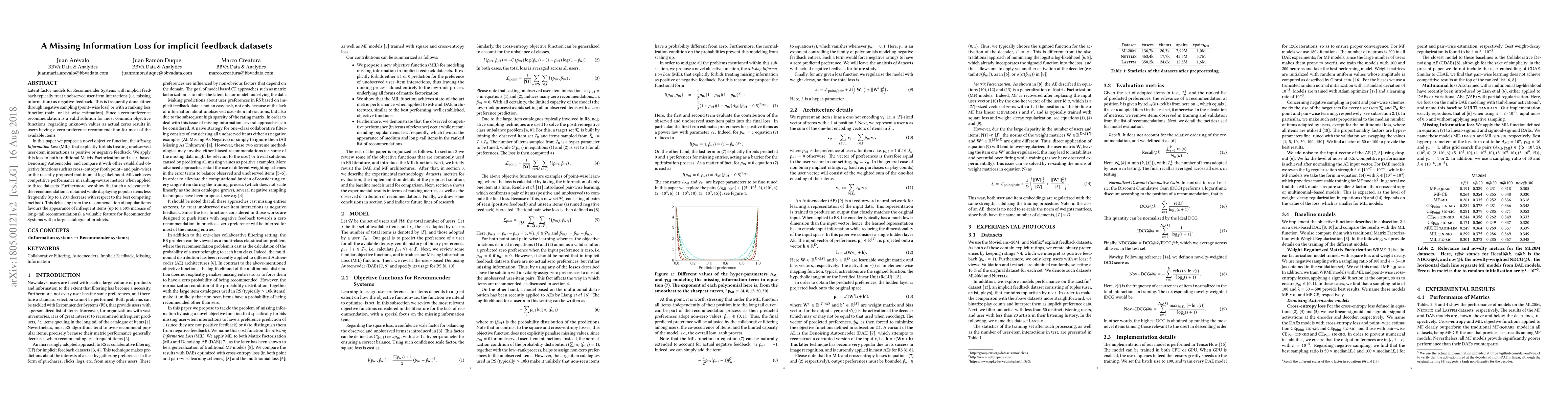 This paper proposes a novel Missing Information Loss (MIL) function for recommender systems using implicit feedback, which avoids treating unobserved interactions as negative feedback. MIL is shown to achieve competitive performance in ranking metrics while reducing the recommendation of popular items and increasing the appearance of infrequent items.