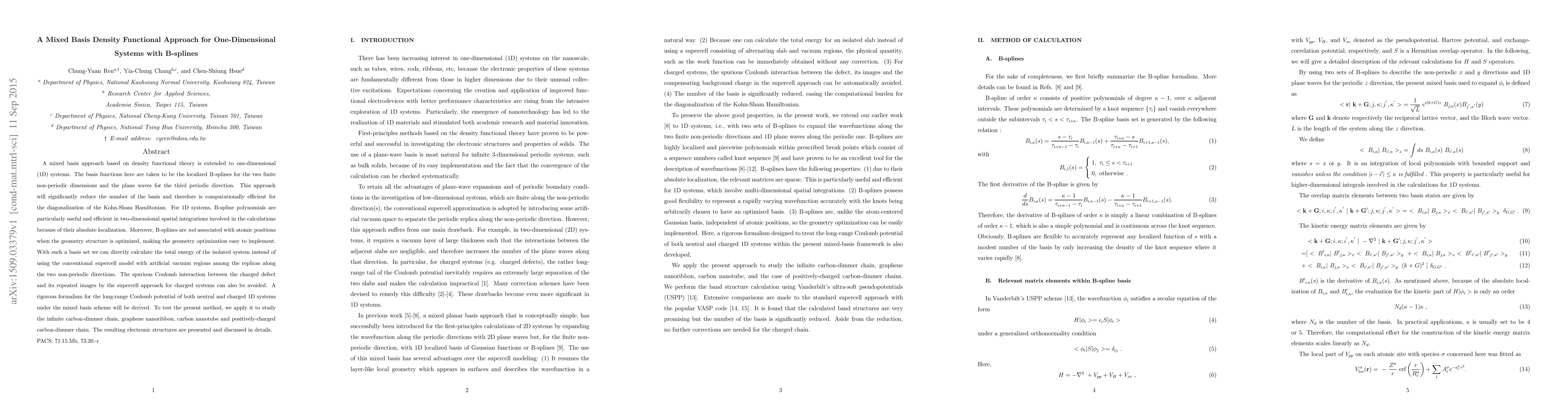 A mixed basis approach based on density functional theory is extended to one-dimensional(1D) systems. The basis functions here are taken to be the localized B-splines for the two finite non-periodic dimensions and the plane waves for the third periodic direction. This approach will significantly reduce the number of the basis and therefore is computationally efficient for the diagonalization of the Kohn-Sham Hamiltonian. For 1D systems, B-spline polynomials are particularly useful and efficient in two-dimensional spatial integrations involved in the calculations because of their absolute localization. Moreover, B-splines are not associated with atomic positions when the geometry structure is optimized, making the geometry optimization easy to implement. With such a basis set we can directly calculate the total energy of the isolated system instead of using the conventional supercell model with artificial vacuum regions among the replicas along the two non-periodic directions. The spurious Coulomb interaction between the charged defect and its repeated images by the supercell approach for charged systems can also be avoided. A rigorous formalism for the long-range Coulomb potential of both neutral and charged 1D systems under the mixed basis scheme will be derived. To test the present method, we apply it to study the infinite carbon-dimmer chain, graphene nanoribbon, carbon nanotube and positively-charged carbon-dimmer chain. The resulting electronic structures are presented and discussed in details.