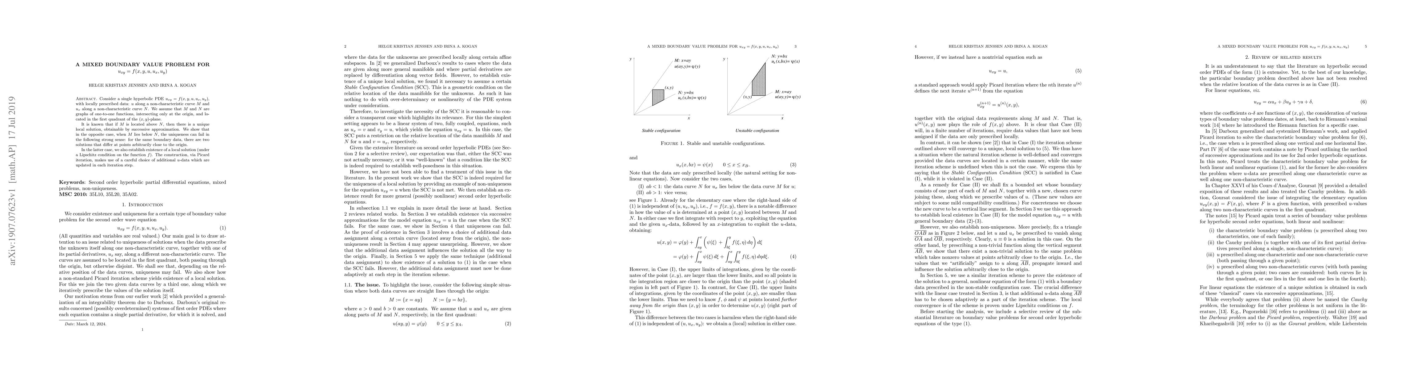 Consider a single hyperbolic PDE $u_{xy}=f(x,y,u,u_x,u_y)$, with locally prescribed data: $u$ along a non-characteristic curve $M$ and $u_x$ along a non-characteristic curve $N$. We assume that $M$ and $N$ are graphs of one-to-one functions, intersecting only at the origin, and located in the first quadrant of the $(x,y)$-plane. It is known that if $M$ is located above $N$, then there is a unique local solution, obtainable by successive approximation. We show that in the opposite case, when $M$ lies below $N$, the uniqueness can fail in the following strong sense: for the same boundary data, there are two solutions that differ at points arbitrarily close to the origin. In the latter case, we also establish existence of a local solution (under a Lipschitz condition on the function $f$). The construction, via Picard iteration, makes use of a careful choice of additional $u$-data which are updated in each iteration step.