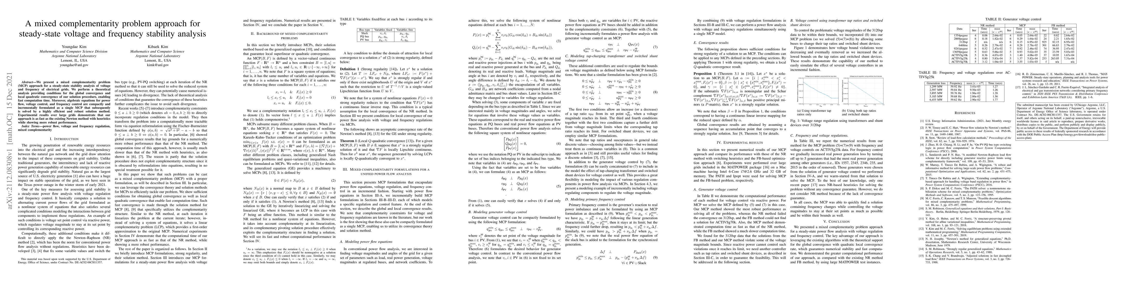 We present a mixed complementarity problem (MCP) approach for a steady-state stability analysis of voltage and frequency of electrical grids. We perform a theoretical analysis providing conditions for the global convergence and local quadratic convergence of our solution procedure, enabling fast computation time. Moreover, algebraic equations for power flow, voltage control, and frequency control are compactly and incrementally formulated as a single MCP that subsequently is solved by a highly efficient and robust solution method. Experimental results over large grids demonstrate that our approach is as fast as the existing Newton method with heuristics while showing more robust performance.