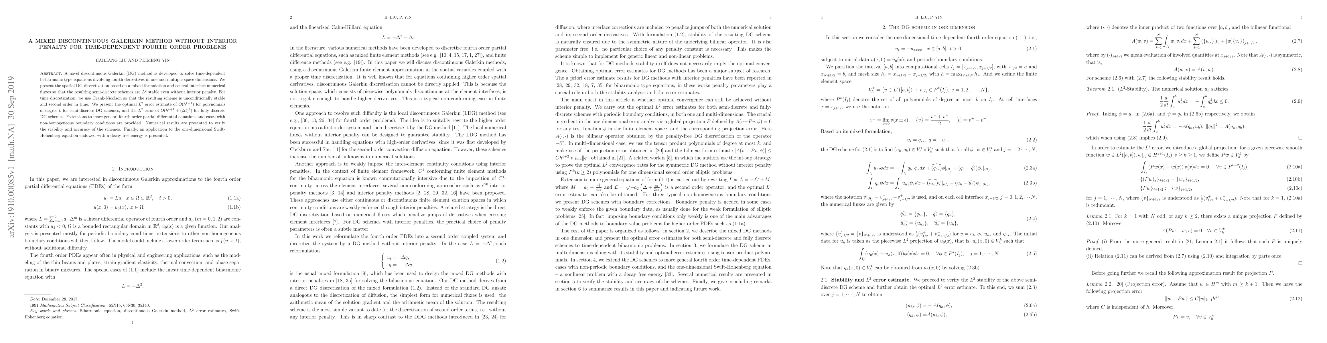 A novel discontinuous Galerkin (DG) method is developed to solve time-dependent bi-harmonic type equations involving fourth derivatives in one and multiple space dimensions. We present the spatial DG discretization based on a mixed formulation and central interface numerical fluxes so that the resulting semi-discrete schemes are $L^2$ stable even without interior penalty. For time discretization, we use Crank-Nicolson so that the resulting scheme is unconditionally stable and second order in time. We present the optimal $L^2$ error estimate of $O(h^{k+1})$ for polynomials of degree $k$ for semi-discrete DG schemes, and the $L^2$ error of $O(h^{k+1} +(\Delta t)^2)$ for fully discrete DG schemes. Extensions to more general fourth order partial differential equations and cases with non-homogeneous boundary conditions are provided. Numerical results are presented to verify the stability and accuracy of the schemes. Finally, an application to the one-dimensional Swift-Hohenberg equation endowed with a decay free energy is presented.