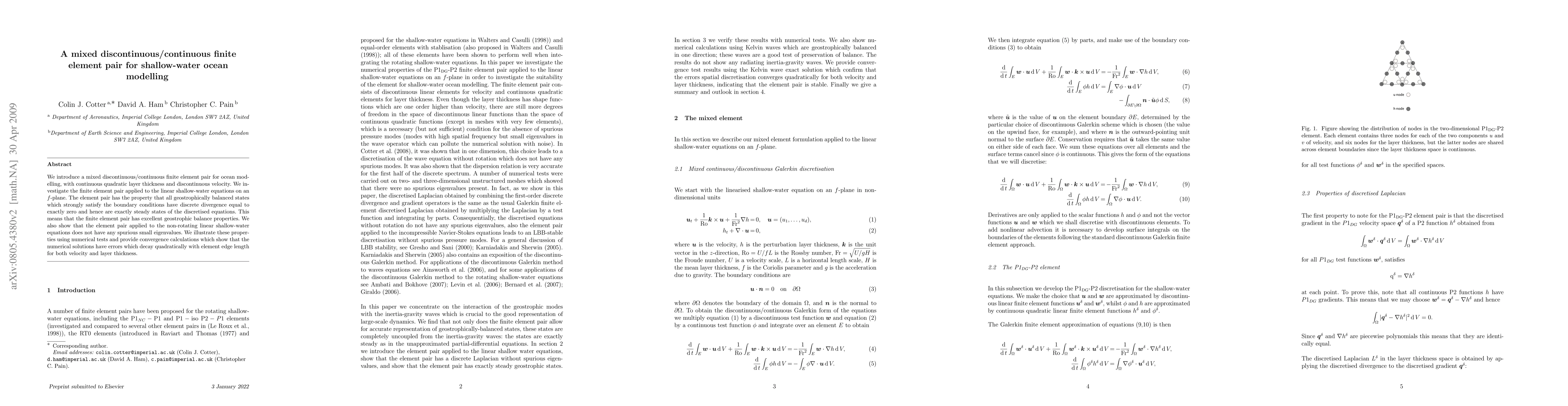 This paper proposes a mixed discontinuous/continuous finite element pair for ocean modelling, demonstrating its application to shallow-water equations. The method exhibits excellent geostrophic balance and stability, with numerical tests showing quadratic convergence errors.