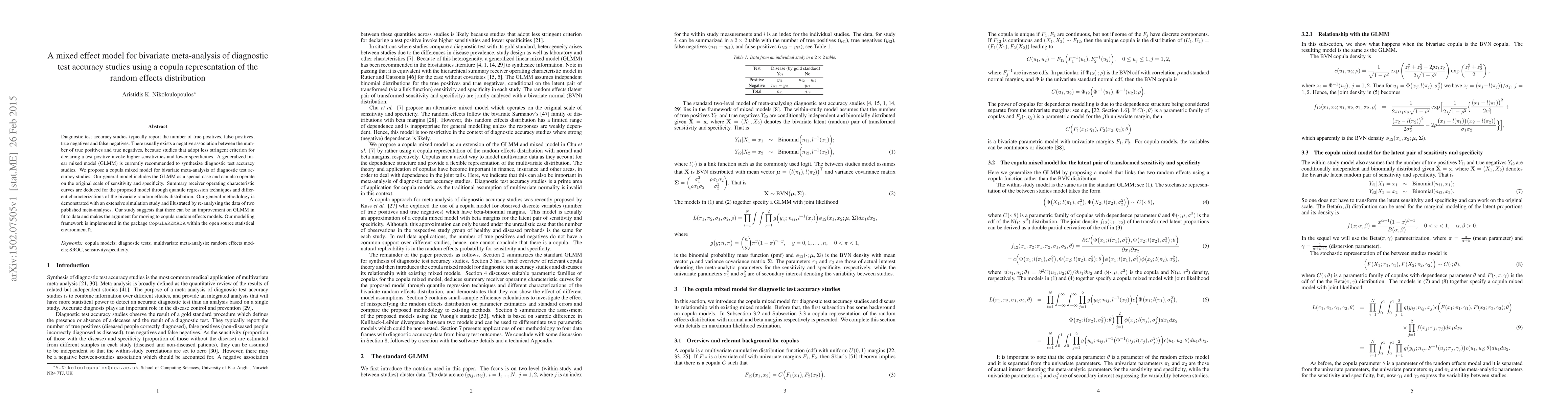 This paper proposes a copula mixed model for bivariate meta-analysis of diagnostic test accuracy, improving upon the generalized linear mixed model (GLMM) by better capturing the negative association between sensitivity and specificity. The new model is demonstrated through simulation and real data examples, suggesting enhanced fit and implemented in the R package CopulaREMADA.