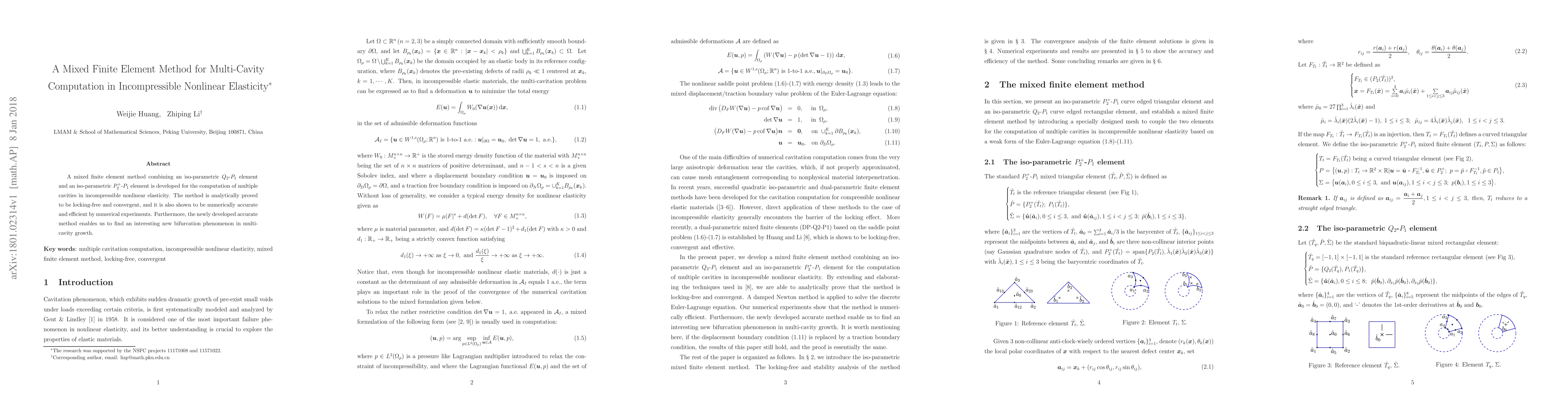This paper develops a mixed finite element method using $Q_2$-$P_1$ and $P_2^+$-$P_1$ elements for computing multiple cavities in incompressible nonlinear elasticity, proving it to be locking-free, convergent, and numerically accurate. The method also reveals a new bifurcation phenomenon in multi-cavity growth.