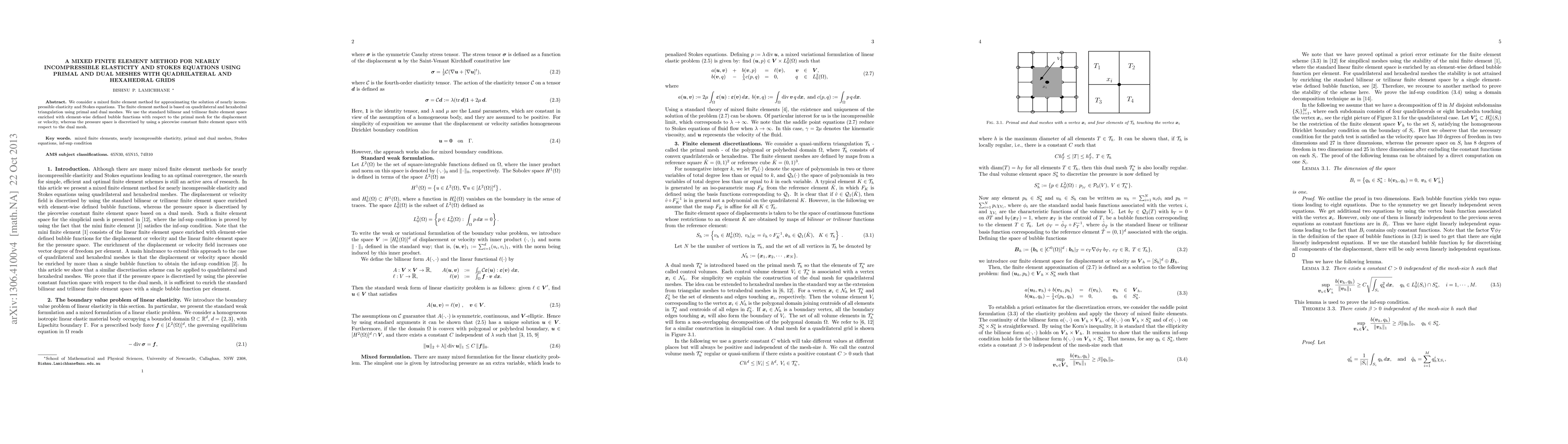 This paper presents a mixed finite element method for solving nearly incompressible elasticity and Stokes equations using quadrilateral and hexahedral grids. The method employs primal and dual meshes, with bubble functions for displacement/velocity and a piecewise constant space for pressure.