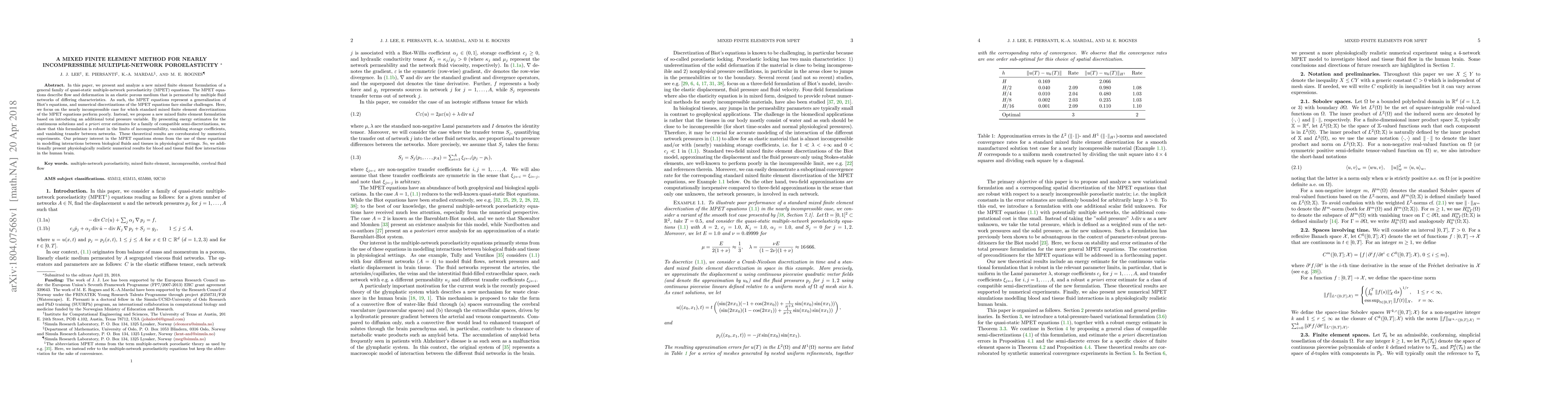 In this paper, we present and analyze a new mixed finite element formulation of a general family of quasi-static multiple-network poroelasticity (MPET) equations. The MPET equations describe flow and deformation in an elastic porous medium that is permeated by multiple fluid networks of differing characteristics. As such, the MPET equations represent a generalization of Biot's equations, and numerical discretizations of the MPET equations face similar challenges. Here, we focus on the nearly incompressible case for which standard mixed finite element discretizations of the MPET equations perform poorly. Instead, we propose a new mixed finite element formulation based on introducing an additional total pressure variable. By presenting energy estimates for the continuous solutions and a priori error estimates for a family of compatible semi-discretizations, we show that this formulation is robust in the limits of incompressibility, vanishing storage coefficients, and vanishing transfer between networks. These theoretical results are corroborated by numerical experiments. Our primary interest in the MPET equations stems from the use of these equations in modelling interactions between biological fluids and tissues in physiological settings. So, we additionally present physiologically realistic numerical results for blood and tissue fluid flow interactions in the human brain.