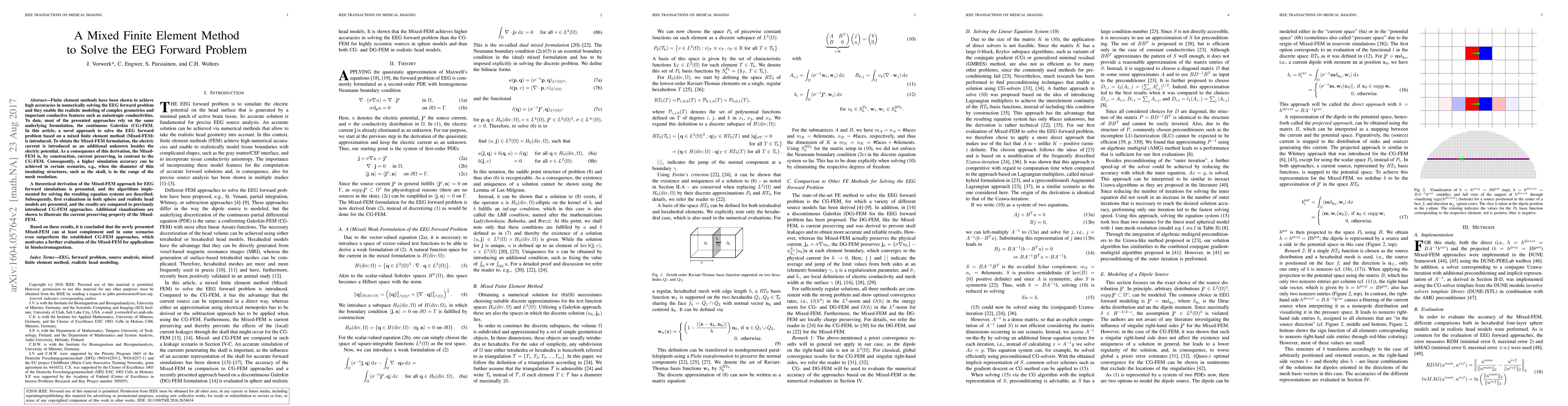 This paper introduces a mixed finite element method (Mixed-FEM) for solving the EEG forward problem, offering a current-preserving approach that potentially enhances accuracy, especially for thin insulating structures. The Mixed-FEM outperforms or complements the traditional continuous Galerkin method in certain scenarios, suggesting its potential for bioelectromagnetism applications.