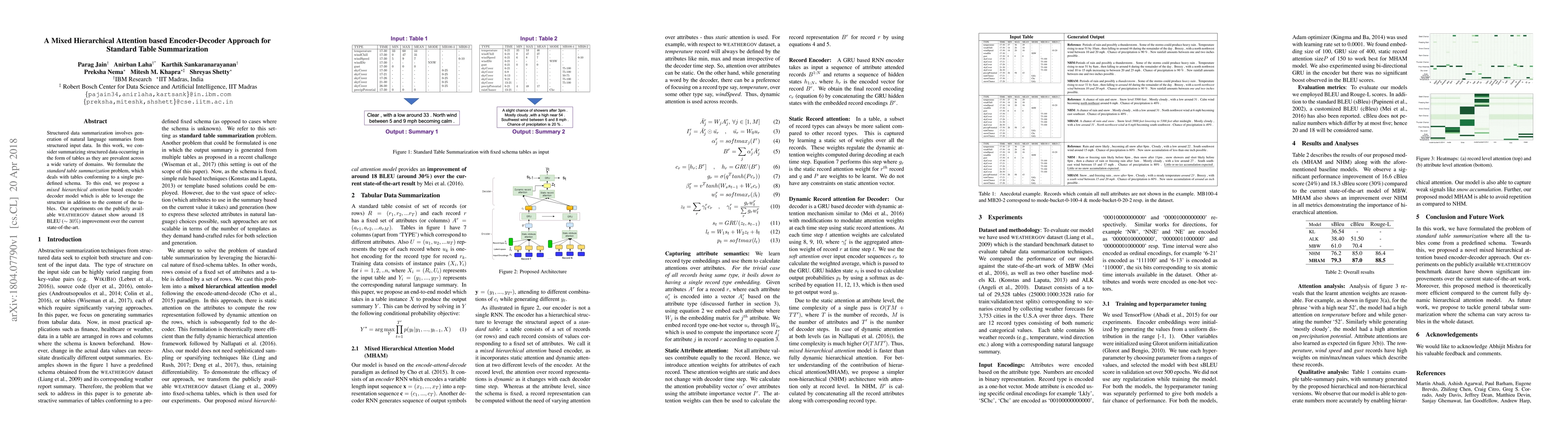 This paper proposes a mixed hierarchical attention-based encoder-decoder model for summarizing tables adhering to a single predefined schema, achieving a notable 18 BLEU score improvement over existing methods, as demonstrated on the WEATHERGOV dataset.