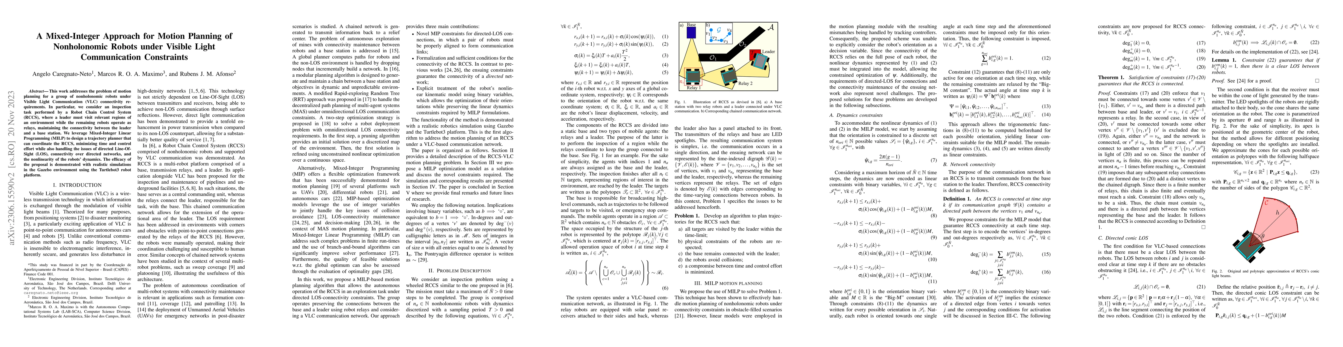 This paper proposes a Mixed-Integer Linear Programming (MILP) approach to plan motion for nonholonomic robots in an inspection task, ensuring connectivity via Visible Light Communication (VLC) while minimizing time and control effort. Simulations using the Turtlebot3 in Gazebo validate the effectiveness of the proposed method.