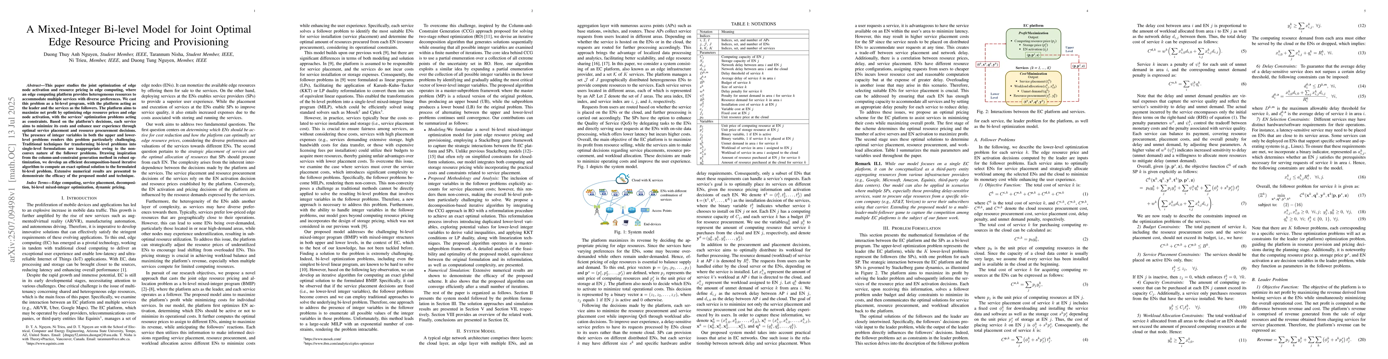 This paper studies the joint optimization of edge node activation and resource pricing in edge computing, where an edge computing platform provides heterogeneous resources to accommodate multiple services with diverse preferences. We cast this problem as a bi-level program, with the platform acting as the leader and the services as the followers. The platform aims to maximize net profit by optimizing edge resource prices and edge node activation, with the services' optimization problems acting as constraints. Based on the platform's decisions, each service aims to minimize its costs and enhance user experience through optimal service placement and resource procurement decisions. The presence of integer variables in both the upper and lower-level problems renders this problem particularly challenging. Traditional techniques for transforming bi-level problems into single-level formulations are inappropriate owing to the non-convex nature of the follower problems. Drawing inspiration from the column-and-constraint generation method in robust optimization, we develop an efficient decomposition-based iterative algorithm to compute an exact optimal solution to the formulated bi-level problem. Extensive numerical results are presented to demonstrate the efficacy of the proposed model and technique.
