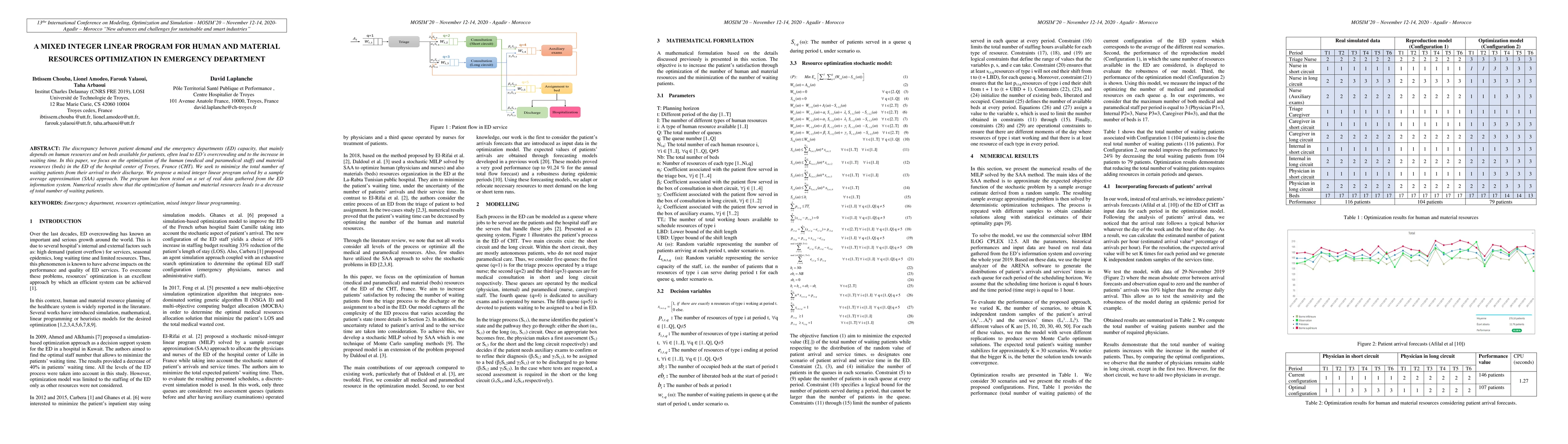 The discrepancy between patient demand and the emergency departments (ED) capacity, that mainly depends on human resources and on beds available for patients, often lead to ED's overcrowding and to the increase in waiting time. In this paper, we focus on the optimization of the human (medical and paramedical staff) and material resources (beds) in the ED of the hospital center of Troyes, France (CHT). We seek to minimize the total number of waiting patients from their arrival to their discharge. We propose a mixed integer linear program solved by a sample average approximation (SAA) approach. The program has been tested on a set of real data gathered from the ED information system. Numerical results show that the optimization of human and material resources leads to a decrease of total number of waiting patients.