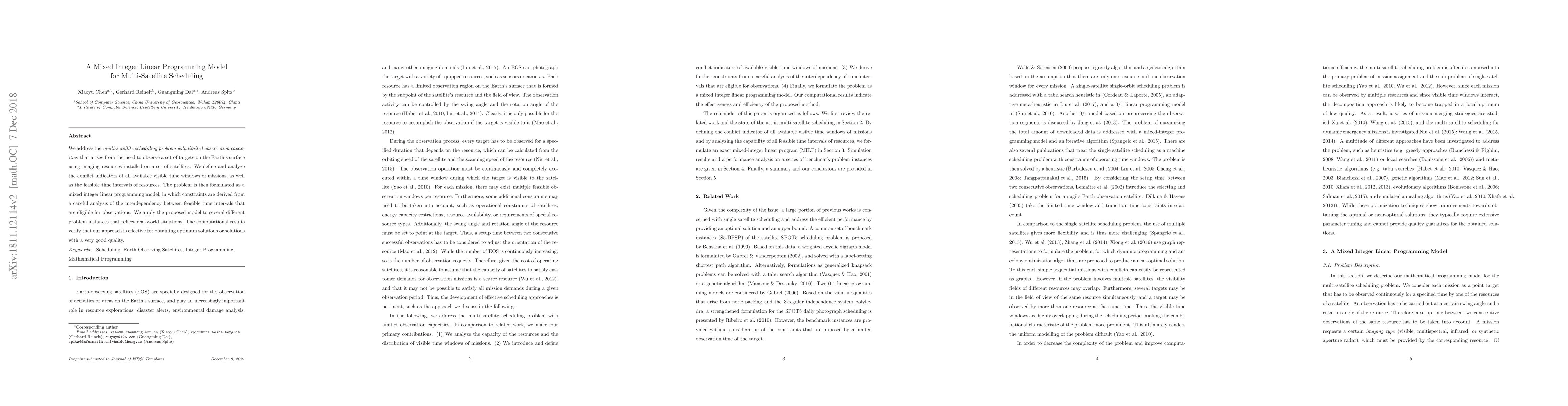 We address the multi-satellite scheduling problem with limited observation capacities that arises from the need to observe a set of targets on the Earth's surface using imaging resources installed on a set of satellites. We define and analyze the conflict indicators of all available visible time windows of missions, as well as the feasible time intervals of resources. The problem is then formulated as a mixed integer linear programming model, in which constraints are derived from a careful analysis of the interdependency between feasible time intervals that are eligible for observations. We apply the proposed model to several different problem instances that reflect real-world situations. The computational results verify that our approach is effective for obtaining optimum solutions or solutions with a very good quality.