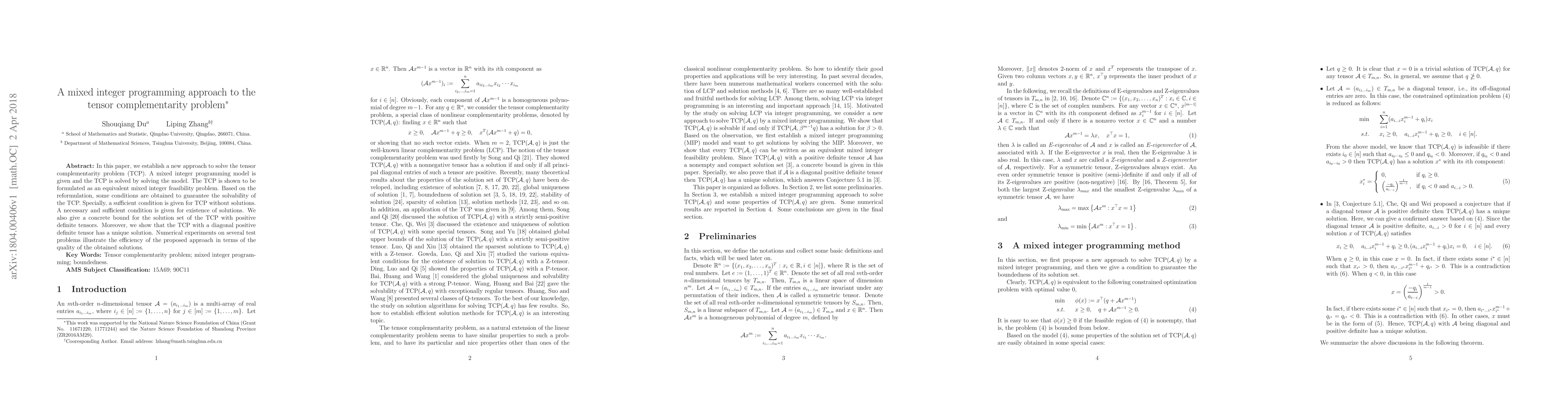 This paper introduces a new approach to solving the tensor complementarity problem (TCP) using mixed integer programming, providing conditions for solvability and uniqueness of solutions.