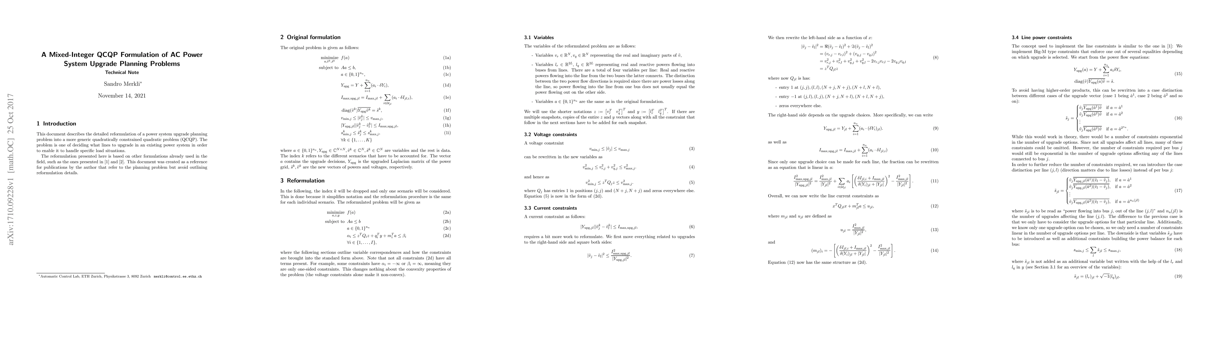 This document describes the detailed reformulation of a power system upgrade planning problem into a more generic quadratically constrained quadratic problem (QCQP). The problem is one of deciding what lines to upgrade in an existing power system in order to enable it to handle specific load situations. The reformulation presented here is based on other formulations already used in the field, such as the ones presented in [1] and [2]. This document was created as a reference for publications by the author that refer to the planning problem but avoid outlining reformulation details.