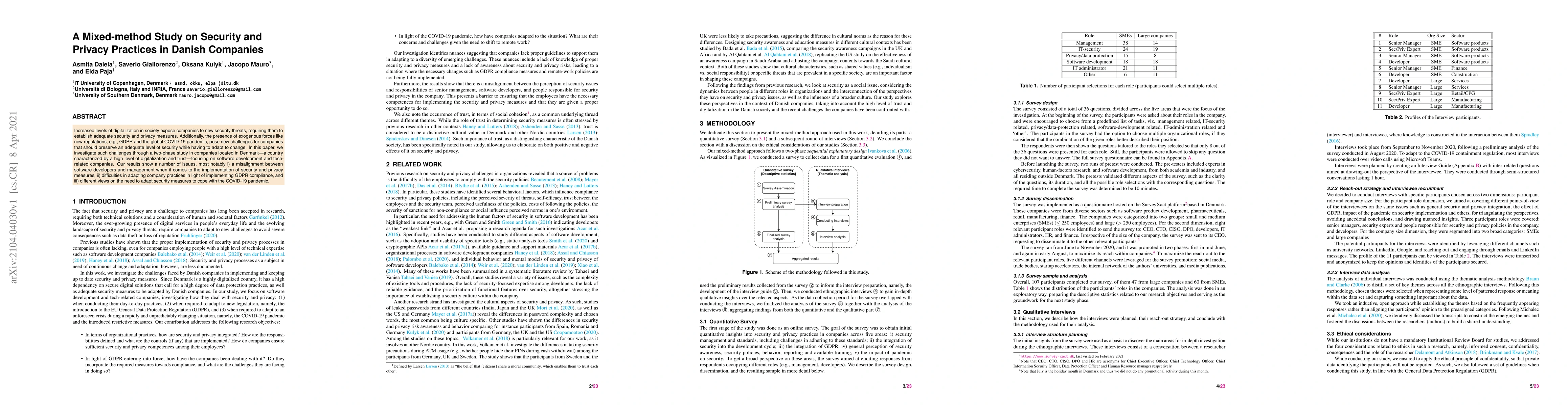 Increased levels of digitalization in society expose companies to new security threats, requiring them to establish adequate security and privacy measures. Additionally, the presence of exogenous forces like new regulations, e.g., GDPR and the global COVID-19 pandemic, pose new challenges for companies that should preserve an adequate level of security while having to adapt to change. In this paper, we investigate such challenges through a two-phase study in companies located in Denmark -- a country characterized by a high level of digitalization and trust -- focusing on software development and tech-related companies. Our results show a number of issues, most notably i) a misalignment between software developers and management when it comes to the implementation of security and privacy measures, ii) difficulties in adapting company practices in light of implementing GDPR compliance, and iii) different views on the need to adapt security measures to cope with the COVID-19 pandemic.