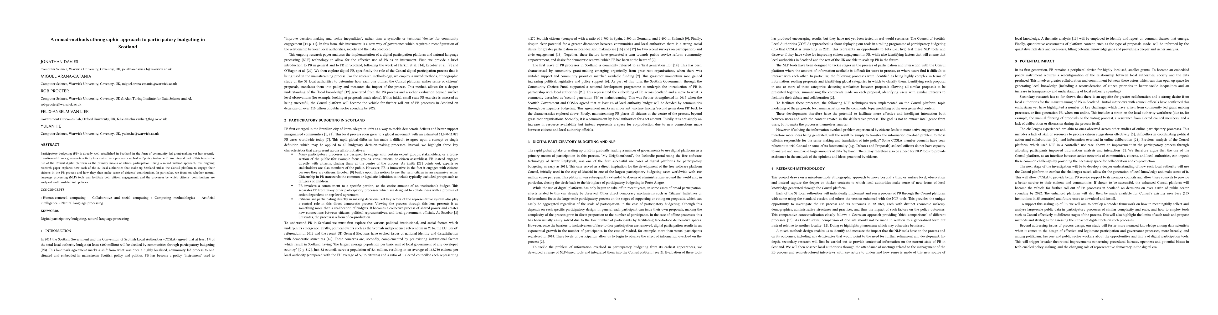 This research employs a mixed-methods ethnographic approach to examine how Scotland's 32 local authorities utilize the Consul platform for participatory budgeting, focusing on the role of natural language processing in enhancing citizen engagement and policy translation.