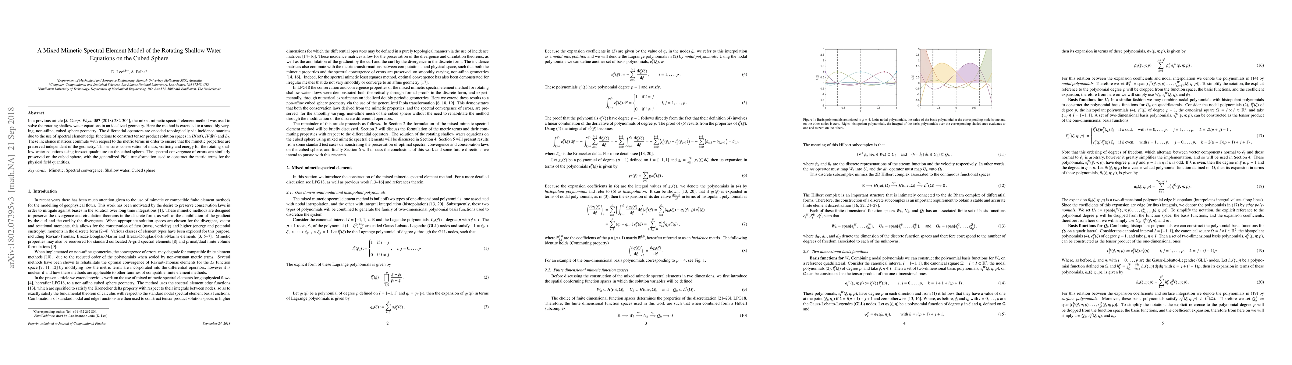This paper extends a mixed mimetic spectral element method to solve the rotating shallow water equations on a cubed sphere, ensuring conservation properties through incidence matrices that commute with metric terms. The method maintains spectral convergence using the generalized Piola transformation.