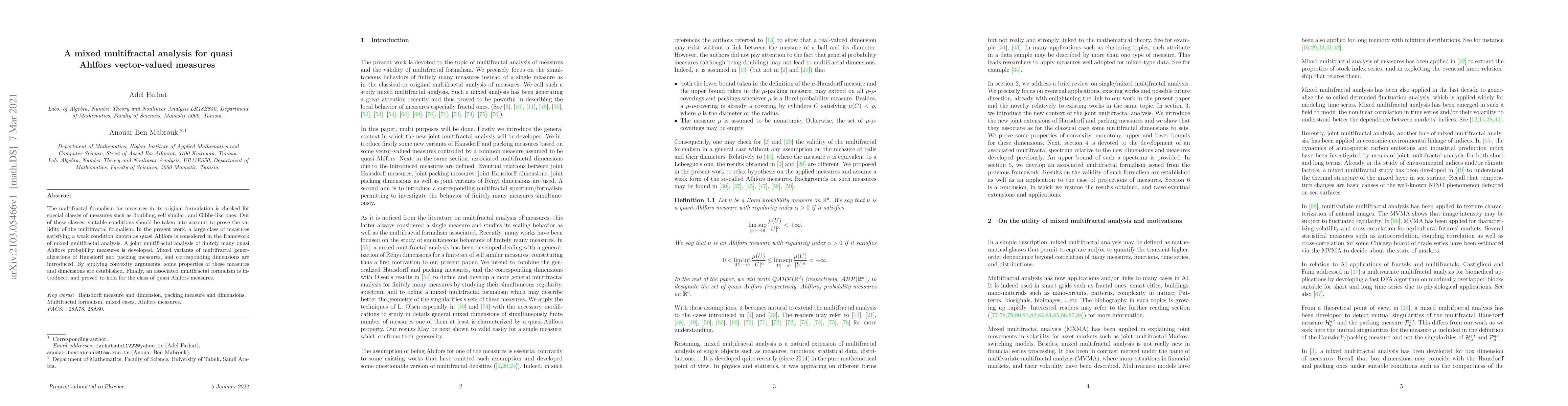 This paper develops a mixed multifractal analysis for quasi Ahlfors vector-valued measures, introducing joint multifractal formalisms for finitely many such measures and establishing properties through convexity arguments. The work proves the validity of the multifractal formalism for this class of measures.
