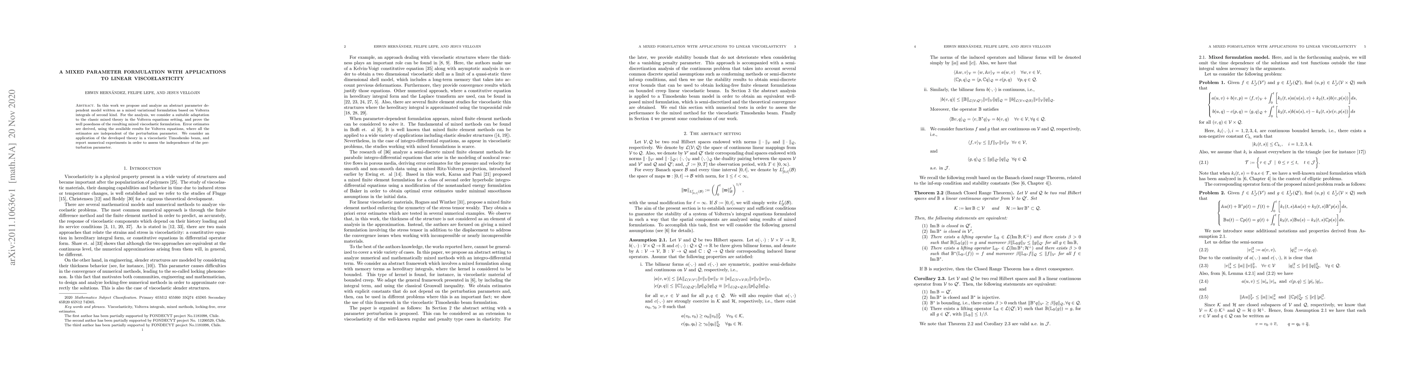 In this work we propose and analyze an abstract parameter dependent model written as a mixed variational formulation based on Volterra integrals of second kind. For the analysis, we consider a suitable adaptation to the classic mixed theory in the Volterra equations setting, and prove the well posedness of the resulting mixed viscoelastic formulation. Error estimates are derived, using the available results for Volterra equations, where all the estimates are independent of the perturbation parameter. We consider an application of the developed theory in a viscoelastic Timoshenko beam, and report numerical experiments in order to assess the independence of the perturbation parameter.
