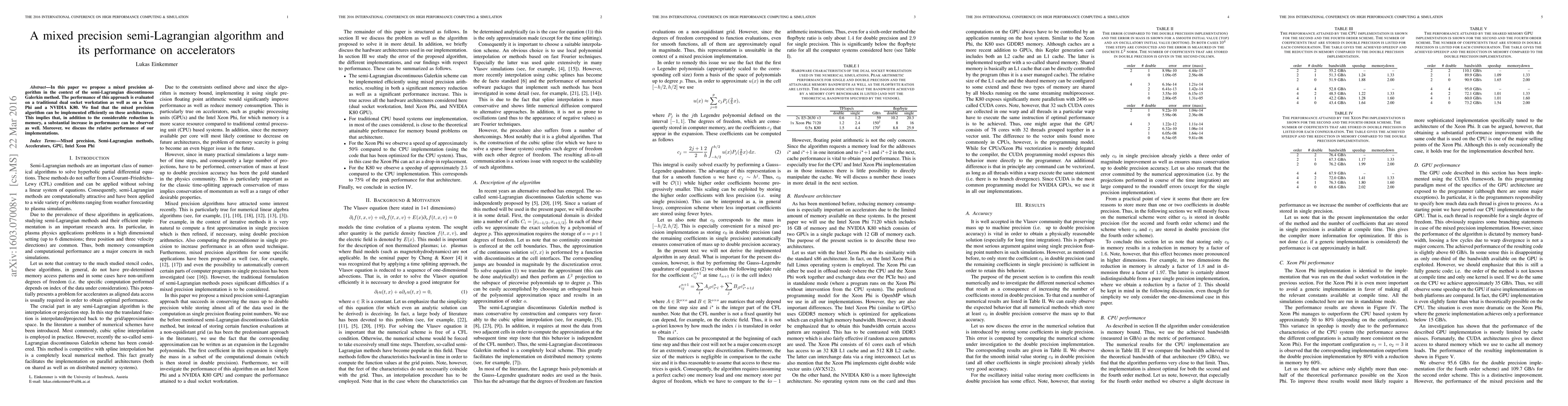 In this paper we propose a mixed precision algorithm in the context of the semi-Lagrangian discontinuous Galerkin method. The performance of this approach is evaluated on a traditional dual socket workstation as well as on a Xeon Phi and an NVIDIA K80. We find that the mixed precision algorithm can be implemented efficiently on these architectures. This implies that, in addition to the considerable reduction in memory, a substantial increase in performance can be observed as well. Moreover, we discuss the relative performance of our implementations.