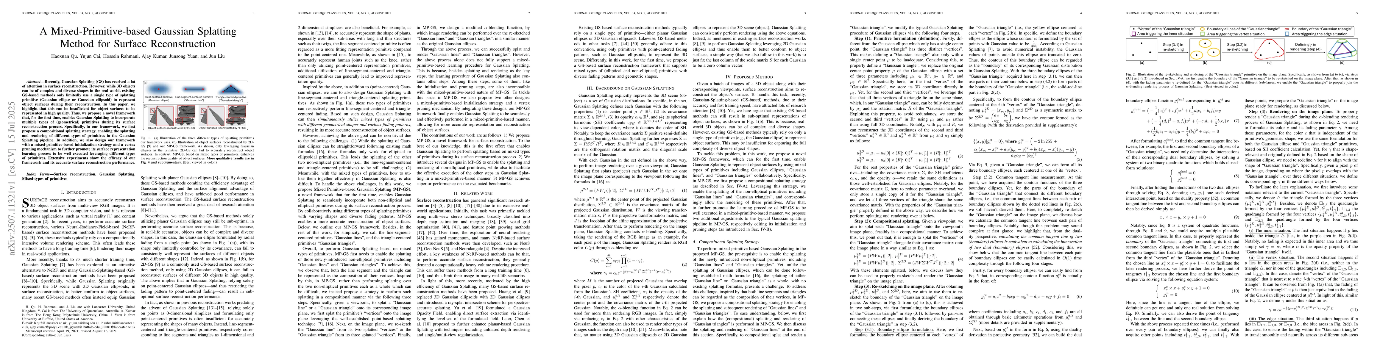 Recently, Gaussian Splatting (GS) has received a lot of attention in surface reconstruction. However, while 3D objects can be of complex and diverse shapes in the real world, existing GS-based methods only limitedly use a single type of splatting primitive (Gaussian ellipse or Gaussian ellipsoid) to represent object surfaces during their reconstruction. In this paper, we highlight that this can be insufficient for object surfaces to be represented in high quality. Thus, we propose a novel framework that, for the first time, enables Gaussian Splatting to incorporate multiple types of (geometrical) primitives during its surface reconstruction process. Specifically, in our framework, we first propose a compositional splatting strategy, enabling the splatting and rendering of different types of primitives in the Gaussian Splatting pipeline. In addition, we also design our framework with a mixed-primitive-based initialization strategy and a vertex pruning mechanism to further promote its surface representation learning process to be well executed leveraging different types of primitives. Extensive experiments show the efficacy of our framework and its accurate surface reconstruction performance.