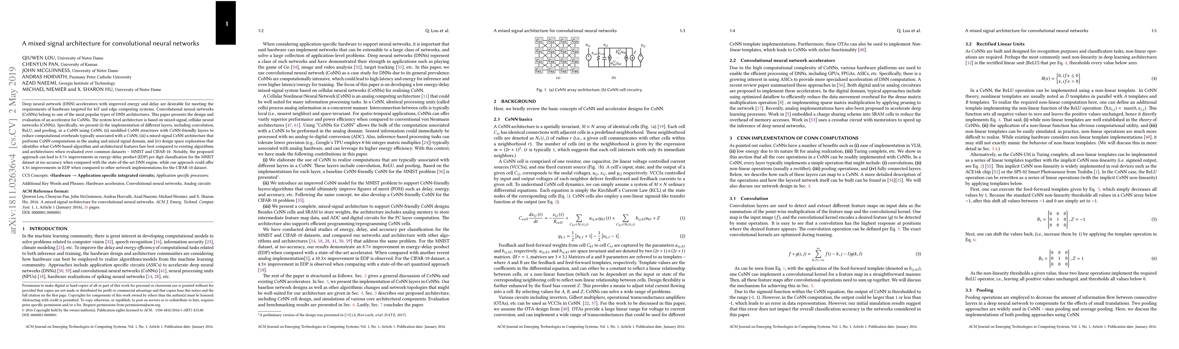 This paper proposes a mixed-signal architecture for convolutional neural networks (CoNNs) using cellular neural networks (CeNNs) to enhance energy and delay performance for IoT and edge computing. The study demonstrates significant improvements in energy-delay product (EDP) for MNIST and CIFAR-10 datasets, achieving 8.7× and 4.3× enhancements respectively compared to state-of-the-art DNN engines.