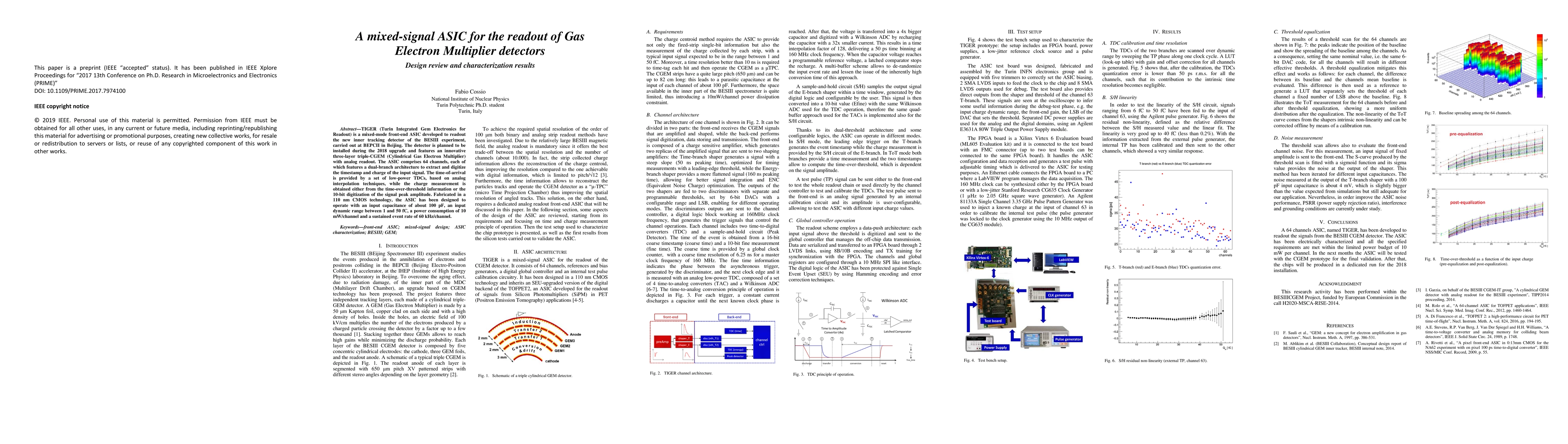 TIGER is a mixed-signal ASIC designed for the readout of innovative triple-CGEM detectors in the BESIII experiment. It features a dual-branch architecture for timestamp and charge extraction, with low-power TDCs and analog interpolation, fabricated in 110 nm CMOS technology.